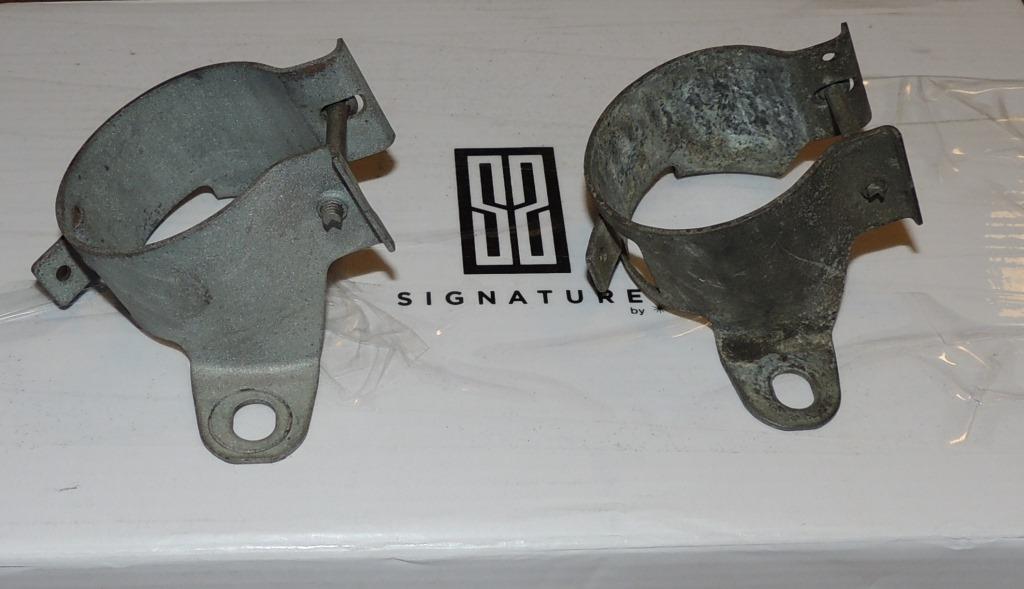 Buyer gets CHOICE of the two. The one on the left has been lightly bead blasted. Very nice, no rust, but I can tell it is a blasted finish. The other one is untouched as it came off the car back in the 70's. It is the original finish with lots of grime, but no rust. I guarantee these to be real deep angled GM brackets. They have not been bent back to look like the correct ones. Each has the original pinch screw. Choice: $40 shipped.