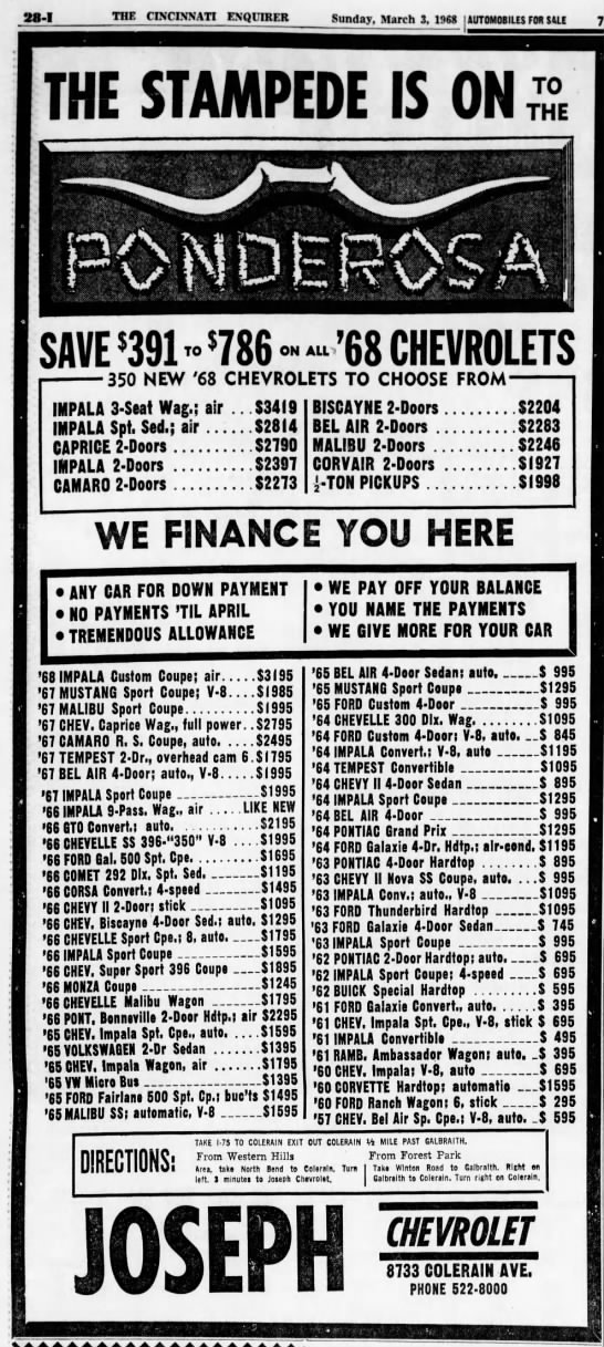 Only clue I have is they were at the Colerain Exit off I-75 back in 68. I believe the dealer is Joseph as they are still on Colerain Road but that's off I-275, not 75 unless the roads were different numbers back then. Thanks