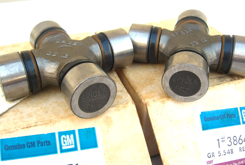 (2) NOS GM drive shaft U-joints. These are the real deal and vintage NOS. Hard to come by that are without the zirt fitting hole. These fit both front or rear. They are made by Spicer for GM and have the Spicer embossed on the joint as well as the caps.