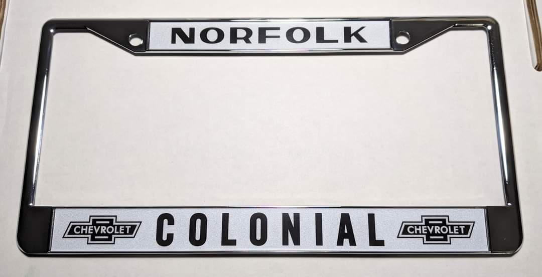 Colonial Chevrolet - Norfolk, VA If you are looking to have dealer or custom plate frames or decals made contact me. Here's a link to my page with some of the other plates, frames and decals I have done & have available: https://www.facebook.com/oldschoolplateframes/ |