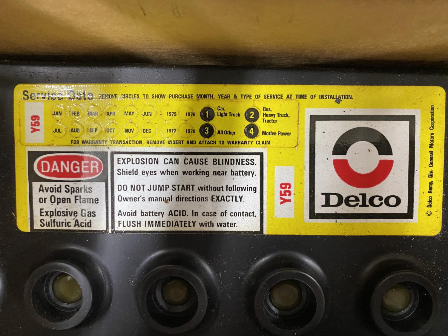 FOR SALE: Three (3) new (unactivated) Delco Energizer Y-59 batteries. All three are top terminal pieces still having the wax plugs. Two are in original cartons; one is without a carton. These are service replacement batteries (yellow tag on top surface). Two have 1977-1980 service dates; the other one has 1975-1978 service date range. The Y-59 is a 3000-watt battery for normal electrical capacity as opposed to the more prevalent (and reproduced) 5000-watt R-59 offering maximum electrical capacity.