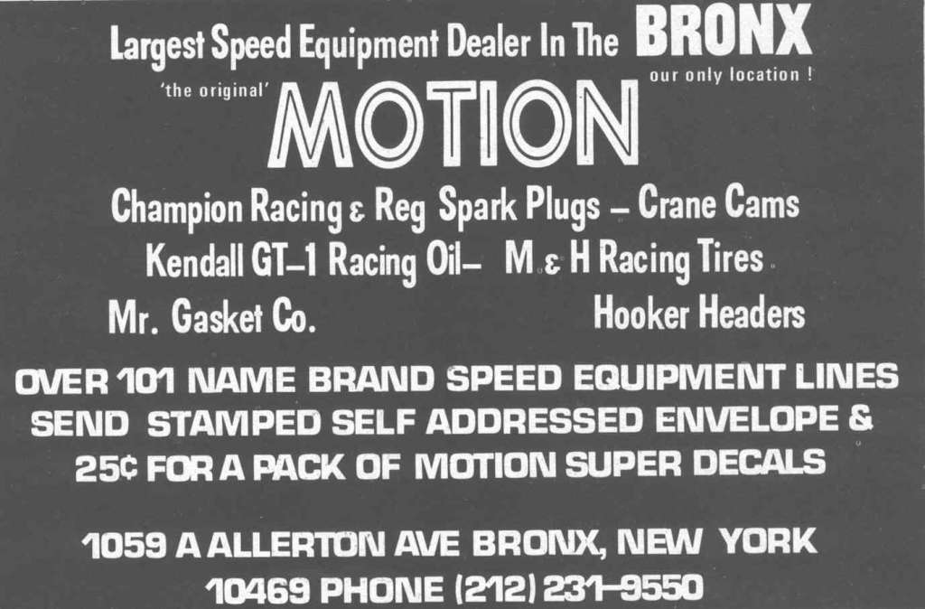 Review High Performance Stocker July 1968.... Baldwin Chevrolet/Merrick Road & Central avenue/Baldwin,L.I., NY/516-223-7770 Motion Performance,Inc/High-Perfomance Sales-Service Divison/598 Sunrise Highway/Baldwin,L.I., N.Y./516-223-3172- 3178 (Take an Attitude) 'The original Motion '1059 A Allerton ave Bronx,New York 10469 Phone (212) 231-9550 Largest Speed Equipment Dealer in the Bronx. [img]/ubbthreads/images/graemlins/biggthumpup.gif[/img] |