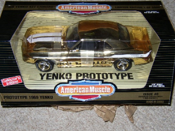 Selling my GOLD plated 1:18 diecast Yenko Camaro. This baby is more rare than a real Yenko Camaro - you have to see it to appreciate it. This is 1 of only 6 made, 3 of which were made available to the public - not the "regular" gold prototype (5000 made) that is part of the Supercar Collectible Series. This diecast would be the ultimate of any diecast collection or would be a great addition to any memorabilia collection. I bought this car from the Yenko Sportscar Club (these guys here) about 2 years ago and comes in it's original box (not perfect, but the plastic is very nice) as well as a letter of authenticity. The car is still in the shipping box that it was sent to me in from the SYC. You may never see a diecast like this for sale again.