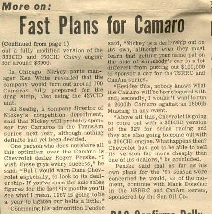 Interesting--in the first clipping they mention use of the 385hp 427 for conversion. Isn't that the '67 Impala SS 427 unit? Also interesting to read Penske's comments on the new Camaro. I guess he soon warmed up to the idea of racing it!