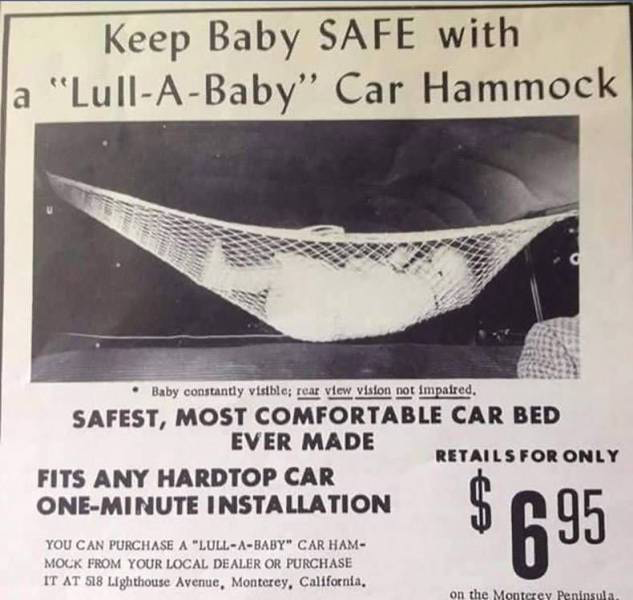The baby seats we had when I was a kid involved laying on the rear package tray. The photo above is a classic. Looks like Ralph Nader? I wonder if anyone questioned why a 5-year old girl is driving a car.