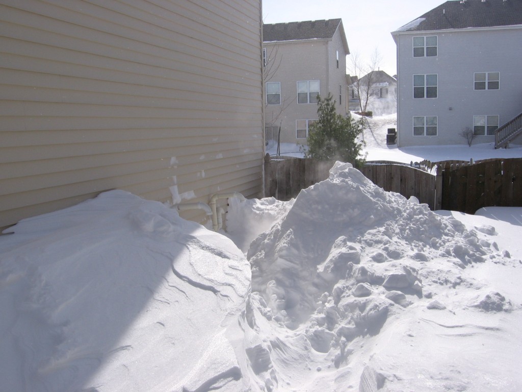 Best of all, woke up this morning to an ice cold house, thermostat showed 59 degrees. Two high efficiency furnaces, both would just turn on for a minute, cycle the fan, and turn off. [img]<<GRAEMLIN_URL>>/hmmm.gif[/img] Turns out the vent pipes, which are 2 feet above ground ( sticking out of the side of the house), were covered in snow. So at 7:00, I went through 2 feet of snow, then with a shovel had to dig and dig through a 4 foot drift to find the vent pipes. These are the pipes, and the drift... This is the first attempt with the snowblower. Notice the area beyond the end of the driveway, that's the street, not plowed yet. The backyard/ That's a 4-foot wood fence.