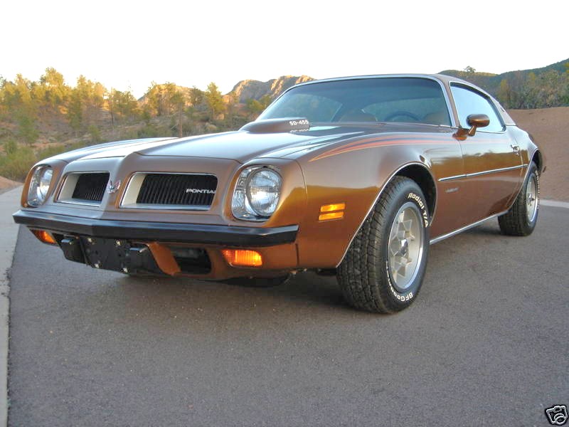 But then a shaker scoop was proposed after one of the big wigs saw a 1969 Mustang Cobra Jet shaker. Everyone liked the idea but Porter, who refused to design a scoop. They eventually approached him with an ultimatum of sorts. Either he designs the shaker scoop, or they (the junior designers) would design their own. To drive home this threat, the designers made a crude hood scoop, placed it on a Firebird hood, and showed it to Porter. Porter then reluctantly sat down, and proceeded to design a beautiful shaker scoop, using the same curves as the Firebird's roofline (another of his contributions). But he really wanted the Trans Am to have the Formula hood. In fact, his own personal 73 Trans Am has a Formula hood to this day! Porter is a true artist, from architecture to paintings, he understands light and shade, reflections, and how everything needed to be tied together. The designers back then were true geniuses, using sketches and clay models to make dreams come true, as opposed to cutting-and-pasting using computer technology like they do today. Here's another 74, seen on E-Bay a couple years ago. [img]<<GRAEMLIN_URL>>/smile.gif[/img]