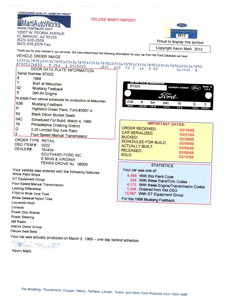 Well the Marti report came and it looks like it was a factory 4 speed car. Looks like it was a very nice car when new. Close to the Bullit Mustang.