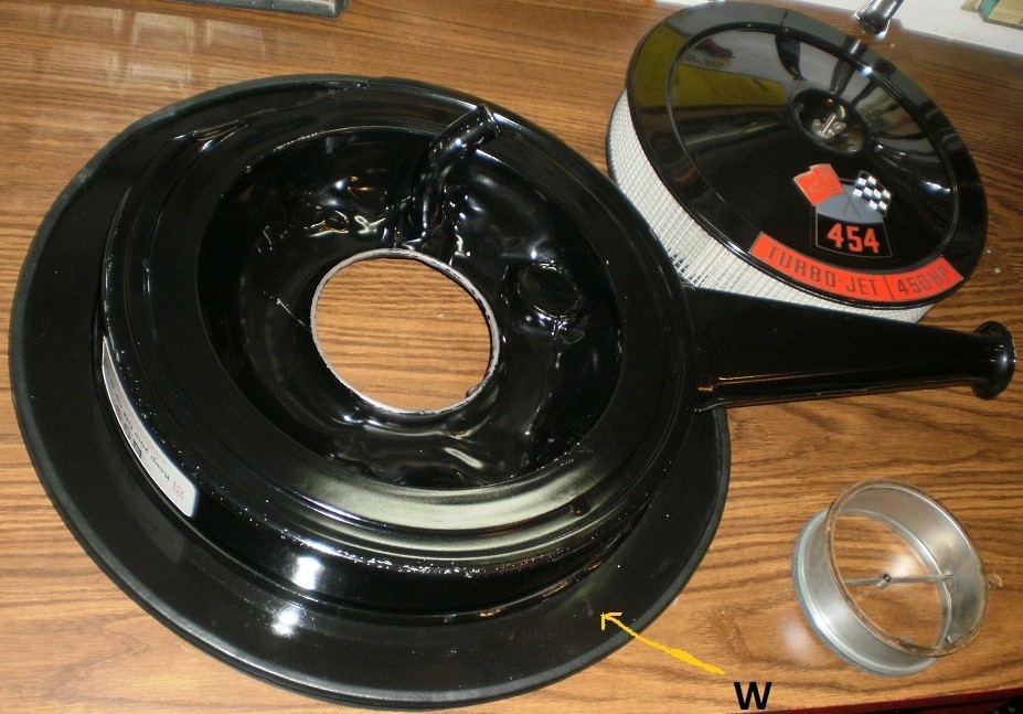 In general,the rubber seals had cloth tape at their seam on the assembly line & OTC..todays repros are hot glued.Some are disguising with cloth tape today too. The metal flange that holds the seal,has a flat spot @ the 9 to 11 O'clock position on the 70-72 Chevelles. The 69 Z/28's & ZL-1's were a perfect circle flange,thus no A/C option. Makers mark "W" stamped into originals too. Some 69 Camaros & a few early 70 Chevelles came with a flat bottom housing.The majority 70-72 Chevelles had a valley all around em on the bottom,like todays repro. does,but they are reproducing the flat bottom housing today. Here's a reproduction I recently sold.. https://www.yenko.net/ubbthreads/ubbthrea...true#Post475497 Notice C H Q reproduction stamping. PCV Vent tube isn't as curved as the originals were and doesn't come out as smooth as the 1st design assembly line did. Also originals have a notch in their center seam on the air horn. The rippling in the back on an original is more defined & detailed then a repro.today,as well as the whole design overall. |