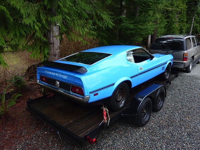 That is how the ad was written... I found this car advertised on Feb. 12, I emailed the seller and asked for his phone number, I had some questions and wanted to make arrangements to see the car. He replied later that evening and I phoned him yesterday morning. The car has been in his family for 25 years, it was his uncles car. It has a strong 351 with an automatic but he said it originally had a 429. I made arrangments to see the car when he got home from work and I told him I will bring cash and a trailer, he thought that was great and because of that I got to see the car first. Now I don't know anything about these cars, nothing at all so I spent most of the day reading all the information I could find, I really enjoy this type of education! Knowing that this car possibly had a 429 I was of course hoping it would be a J code car with the Drag Pac, that would be really cool but I was expecting it to be a 351 car. When we arrived at the sellers home he asked me to meet him around the side of his house where the car was parked. I walked up to it and immediately checked the VIN and there was that &quot;J&quot; I was hoping for, wow! I asked to see the regi/title to make sure the VIN matched and it did. It was pouring rain and I really didn't feel like crawling all over and under the car and since it was a J code it really didn't matter how bad it was, I wanted it so we made a deal and we took it home. Oh, I did look inside and noticed it had a fold down rear seat that was down and it had a bunch of junk on it, I noticed a flat panel underneath everything, I hoped it was for the Ram Air system, it was. I sent for the Marti Report last night at 9:55pm and recieved it this morning at 8:05am, that was quick. The car was built at Dearborn in Dec. 1970, 429-4V Engine Ram Air, Four Speed Close Ratio Transmission, 3.50 Traction-Loc Rear Axle, Grabber Blue Paint, White Clarion Knit/Corinthian Vinyl Bucket Seat, Immersion Block Heater, F70x14 Wide Oval Belted Raised White Letter Tires, Power Steering, Sport Deck Rear Seat, Power Front Disc Brakes, Rear Window Electric Defrost, AM/FM Stereo Radio, Console and Tinted Glass. The Dealer was P. E. Boisvert Auto Ltee in Boucherville, Quebec, Canada. This is my second Ford, my grandmother gave me her 1956 Ford Zephyr in 1982 when I was 15 years old [img]<<GRAEMLIN_URL>>/smile.gif[/img]