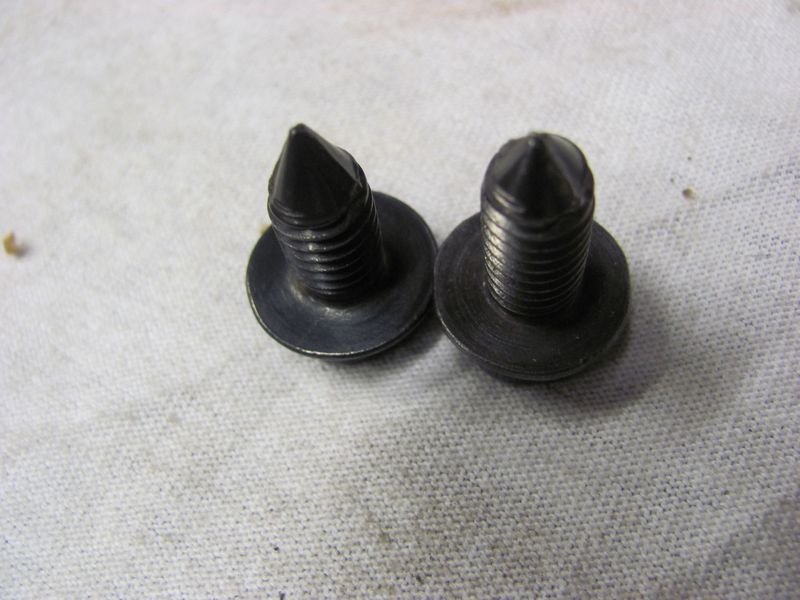 Again the repro bolt is on the left. Now looking at the side you can see the real difference the threads and tip. The original bolt is 7/8" from under the head to the tip and because of the new manufacturing process they can't reproduce the original "Pinch Point" on the end making it noticeably sharper, pointer and longer causing the threads to be cut short to retain the overall length. So a 7/8" bolt has 3/4" thread. This is easily spotted by a sharp eyed judge and now you!!!