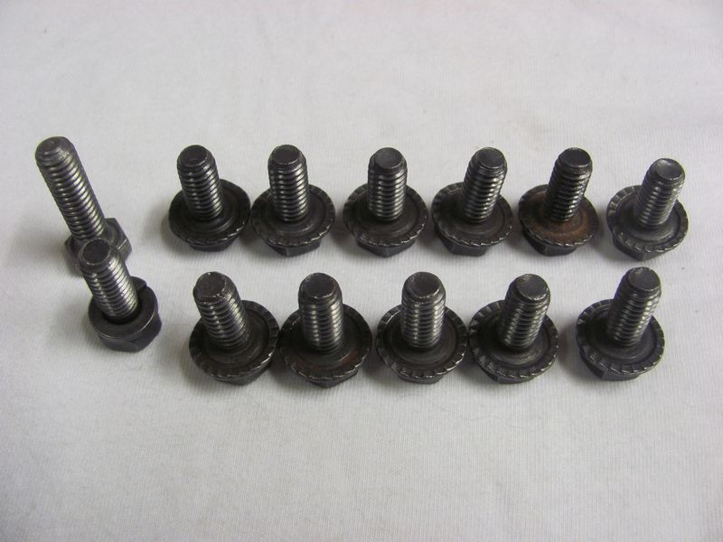 3 sets of 12 bolt cover and rubber brake hose mounting hardware for Camaros, Chevelles, Novas and other GM cars. The cover bolts have the serrated locking teeth on the undersides of the heads (repros don't) and the hose bracket to rear bolt has a captured lock washer