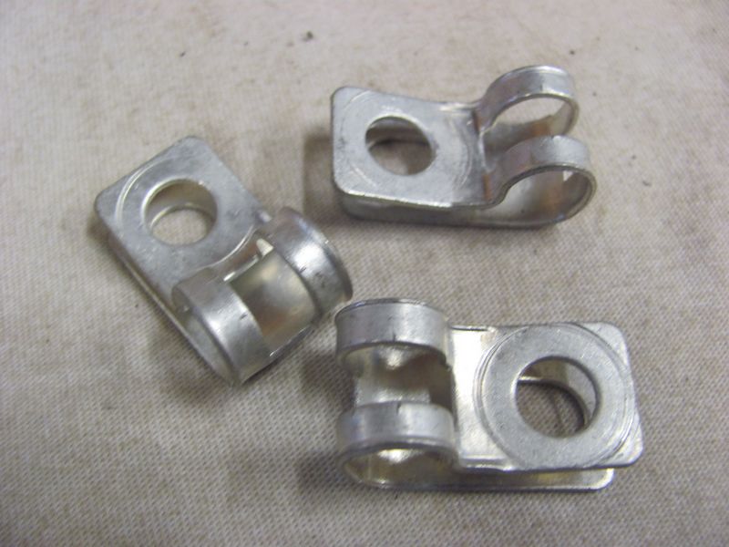 set of 3 Camaro Chevelle Nova double strap 3/8" High Perf fuel line clips with size ID and pt# stamping on back Replated and very nice.