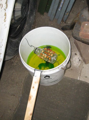 A tray filled with used kitty litter. We have four cats and I set out a few trays with their "pee-balls" in them by the garage doors. If that isn't enough I have a few mouse traps set up right next to them for the really brave mice.
