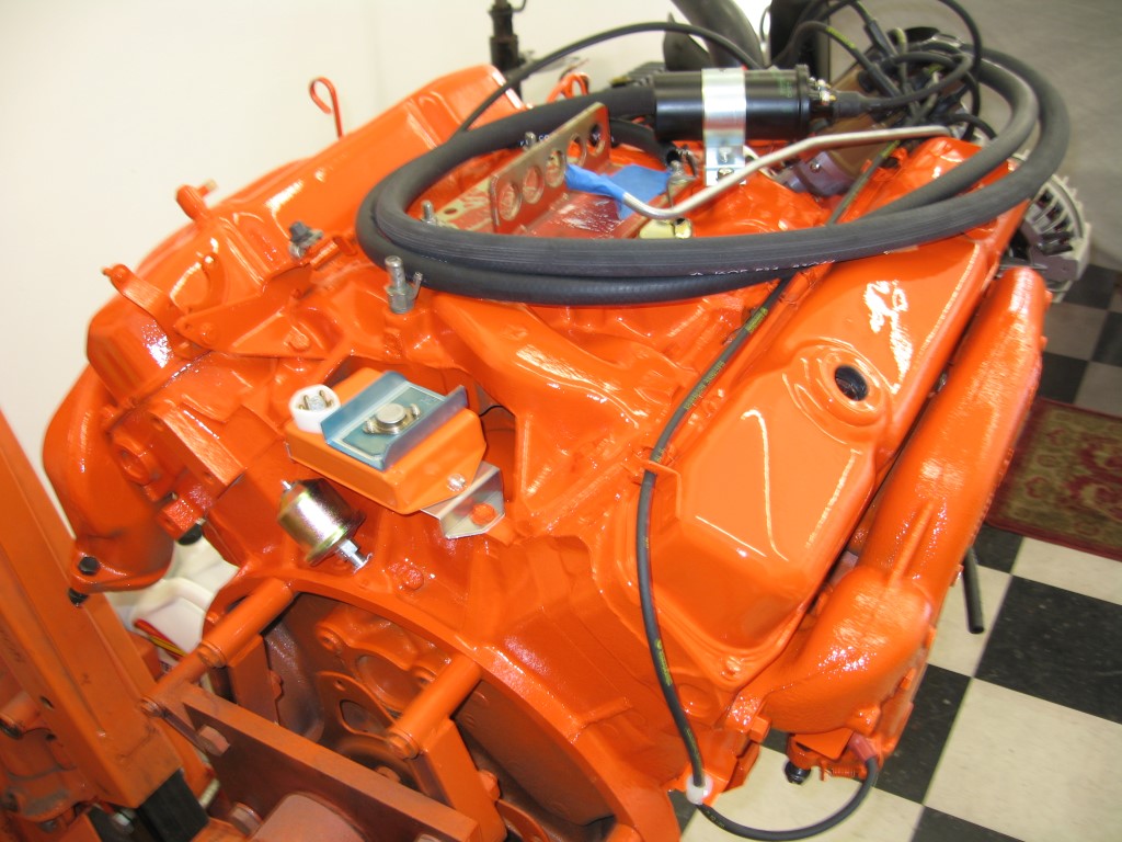 Alternator has a new style pulley on it and the pulley should be black like all other pulley's. Looks like your using old strut rod bushings, I see cracking in the pictures and that is a No No. You coil looks old, should be semi gloss black with Green Lettering and date code. Coil bracket should be silver zinc. The whole steering box should be painted Black but not the spline d shaft. PCV valve and grommet engine color. The vacuum fittings screwed into the intake and water pump housing including the temp. sender shouldn't be painted. The oil pressure switch at rear of block looks used, should be yellow cad. plated. Rear marker light Bezels should be stripe color (Black) Upper shock bushings should have never been left in there during painting process. Oval plastic plug on lower driver side of engine compartment shouldn't be painted either. Distributor cap should be Tan not Black. I saw the Pentastar still on passenger fender during priming, hopefully wasn't painted over with R6. Ground-strap at rear of manifold painted with engine same as Neg. Battery cable. Voltage regulator show have yellow print on it and date code. The bracket at rear of engine that the #8 wire passes through needs to be spun upward. The round white plastic grommet that would snap that wire into it goes unpainted. This is way I remember without going back through the past 11 pages. Ron