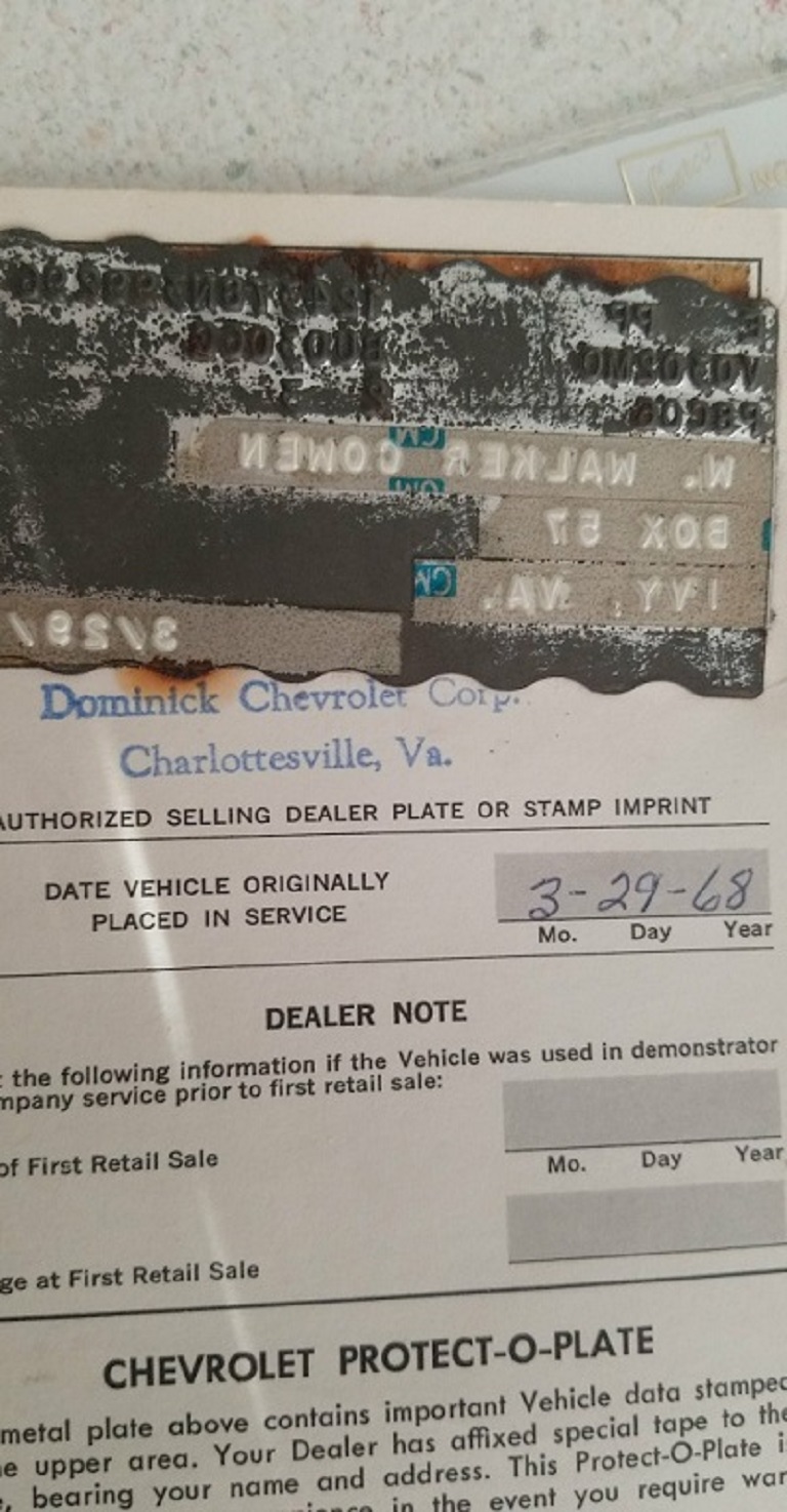Assisting a friend to sell a rare in color Seafrost Green with black standard interior 68 Z/28 that is in good shape, fairly original and has some docs, i.e. Protecto Plate. Just up to recently it was a two owner car according to the paperwork / titles. The car is a low option car that came with radio delete, Non-power steering, Non-console and Non gauges. The Z still retains it's Factory Original BORN WITH Engine, M-21 Trans and BU Rear end. The drive train appears to have never been out of the car. The drive train also appears to have never been opened up with the exception of me removing the cover to inspect if the original gears were still in place. The rear end has its factory dated 2-68 gears and looks awesome inside. This Z still retains a lot of the original Z specific parts, but some are missing. The body tags have never been removed and the confidential VIN matches the Public and or Dash VIN. Pictures to follow as soon as I can. SOLD