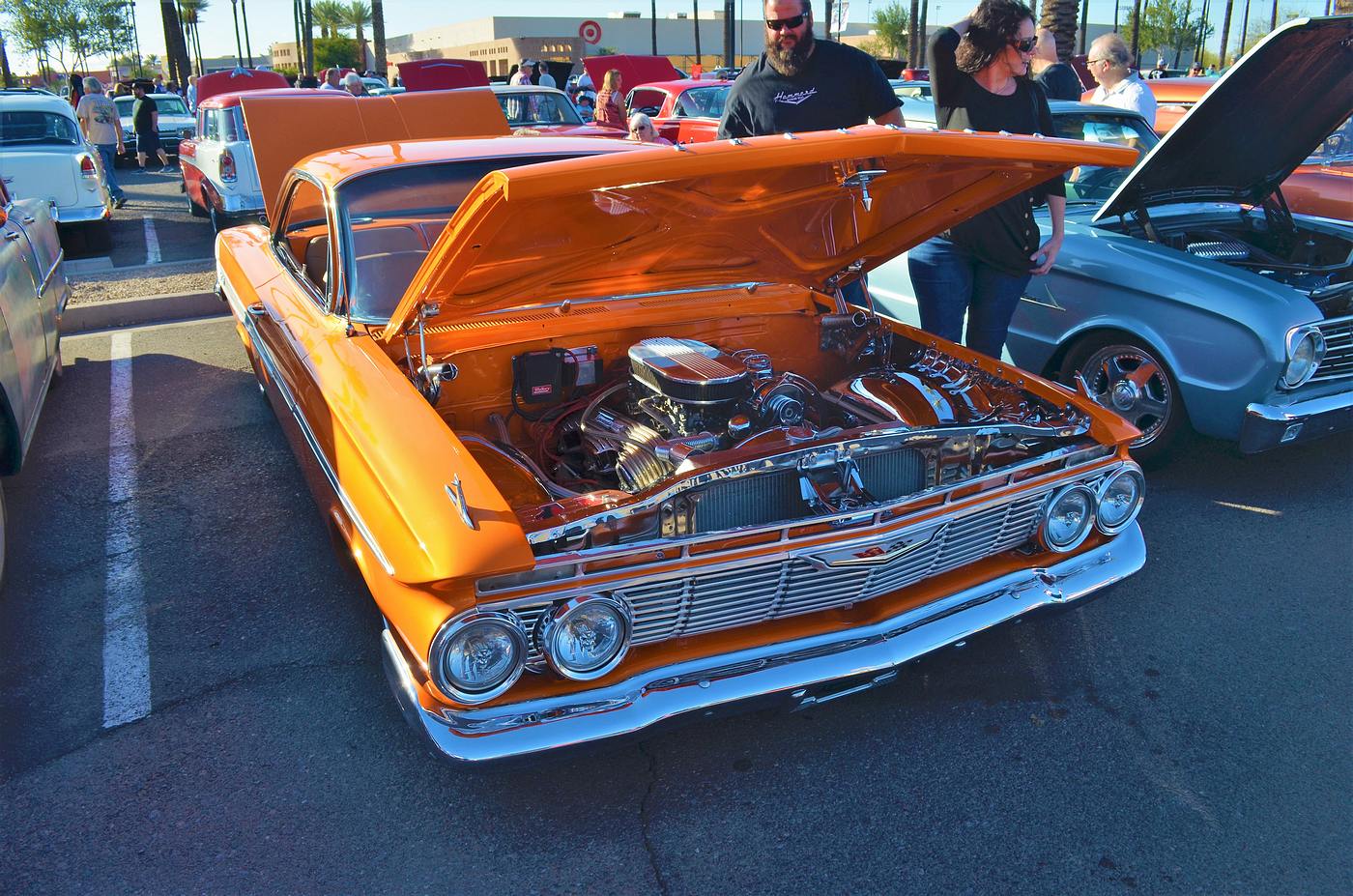 In this group a neat line up of 56, 55 and 57 Chevies, A closer look at the 57 (a Fuelie), a modded Impala, a Bubbletop wagon, a Cougar convertible and an SS454 El Camino.