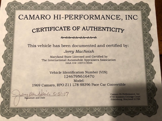 1969 Camaro Pace Car convertible, RS/SS, L78 396-375 HP, 4-spd documented car one of 7 in MacNeish data base. (Previously owned for 31 years) This car is in driver condition and currently has a 350 4spd in car now. Also in the sale is a completely correct L78 396-375 HP engine along with many other NOS GM parts. My friend that passed away last year purchased this pace car in 1986 at Raceway Park, Englishtown NJ spring swap meet. The guy he purchased it from resided in Toms River NJ and purchased it new from Hawthorne Chevrolet in Hawthorne NJ. The Camaro was raced at Englishtown Race track (Raceway Park) through the 70's until my friend's wife purchased it for him as their wedding gift. They used the Camaro sparingly until his death in 2016. This Camaro currently runs and drives excellent but due to its rarity, should be restored back to its original condition. The Camaro was certified by Jerry MacNeish of Camaro High Performance and comes with his Certificate and Inspection Sheets. The NCRS Shipping Data Report, and the original registration transfer to Dave, the last owner since 1986. The car has its original, never removed cowl tag and hidden second VIN #. The interior is original other than the reproduction front seat covers. The original date coded trunk mat is still present in excellent condition and the trunk still shows the original speckle paint. This car comes with many original parts and NOS parts including a complete Date coded 396/375 HP engine from carb to pan.