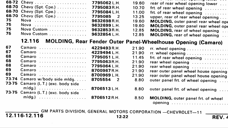 $600 now, thanks. Hi Everyone, I have a complete NOS set of 69 Camaro wheel well opening moldings (in the beat wrappers). The wrappers are all but gone and disintegrated but are still hanging on - photos of all printed part numbers shown FYI. The plastic is stuck to the mouldings and the paper is flaking off but these are real, and NOS from the 70s - not recent replacement pieces. They may likely need a good clean up / polish. See the photos. Whole set of four: 3953635 Left front 3963636 Right front 8.132 8700969 Left rear 8700967 Right rear 12.16 $900 F&F PayPal shipped to the 48 insured. Thanks sYc, Anthony Last edited by AnthonyS; 09-11-2018 at 11:20 PM. Reason: lower price |