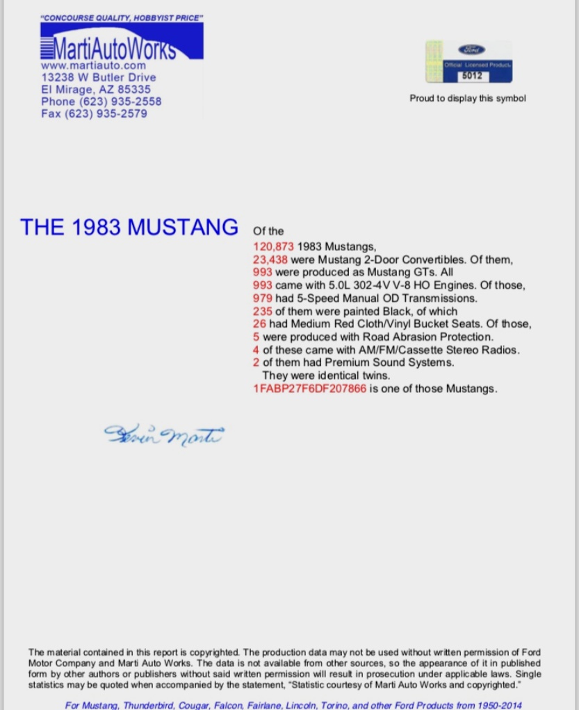 1983 Mustang GT Convertible 5.0L 4V H.O 5-SPD Loaded with options, 19,938 original miles.