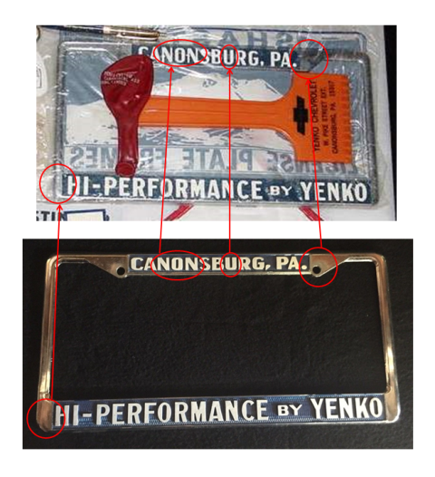 If you compare the Yenko license plate frame on e-bay to known Yenko license plate frames you will notice that there are differences in the width of the script and the design of frame is slightly different. (identified in red).