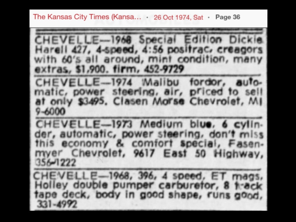 Here's a few more '68 Harrell Chevelle ads but all being Kansas also later than above ad, probably another car also most likely the turquoise one known today?
