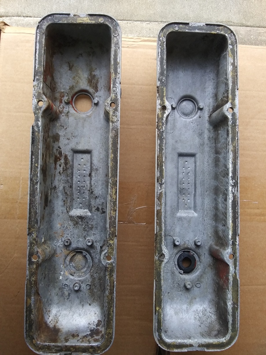 That’s strange. The pictures showed up for me. Both sets were nice originals. Small block stuff is generally worth quite a bit less than other engines since there are more parts available. Maybe $100 in that condition.