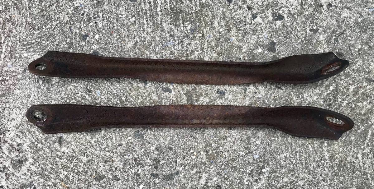 This is a pair of original F41 rear frame reinforcement braces. They are used to stiffen the chassis from the lower rear control arm mounting point to the upper rear control arm mounting point, triangulating the area and preventing crossmember flex and/or cracking. These are a must, especially on a 4-speed car. They will fit any 1968-72 GM A-body. (SOLD)