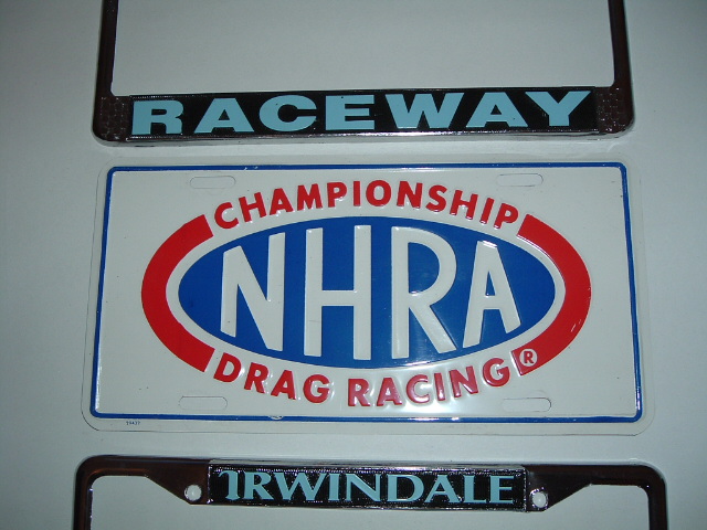 1. NHRA license plate (early 90's) with a new unused set of Irwindale Raceway frames. The NHRA plate was mounted on a display but the Irwindale frames have not been used. $30 shipped in lower 48.