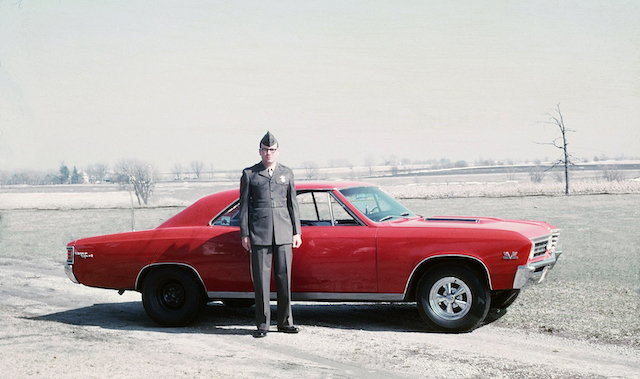Here's some backstory to that pic. I had returned home from 6 mos of boot camp and training in CA. On weekend passes I had been to the '70 WinterNationals at Pomona and a couple times to OCIR. Also experienced some LA car culture cruising Van Nuys and Whitter Blvds. and seeking out George Barris's and Bill Thomas's shops among others. After 2 weeks leave I was to report to Camp LeJune, Jacksonville, NC, March 23rd IIRC, of course I was driving the Chevelle. I swapped the 4:88s for 4:10 "highway gears" and pulled the slicks in favor of Dan Vasic's ultimate, black rear rims, with H-60 Goodyear Polyglass for the trip to NC. Somewhere nearby was a drag strip on an abandoned stretch of highway that I'm told is still in operation?? The traction was horrible, Best launch was starting in 2nd slipping the clutch and feathering the gas, still managed low-mid 13s. My best friend was another Marine from KC who had a very healthy red 327/300 '65 Nova. Early June I received the inevitable orders for beautiful SE Asia and the party was over. The Chevelle went back into Dad's garage until July of '71. Bill W |