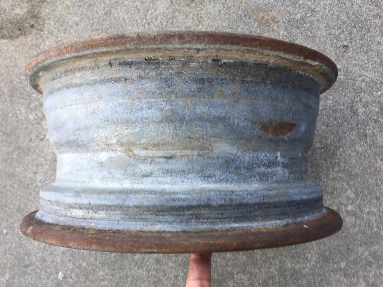 Steel wheel with aluminum center section. Bead area nice, some oxidation on aluminum and general dust from years of non use. Driver as-is or to restore.