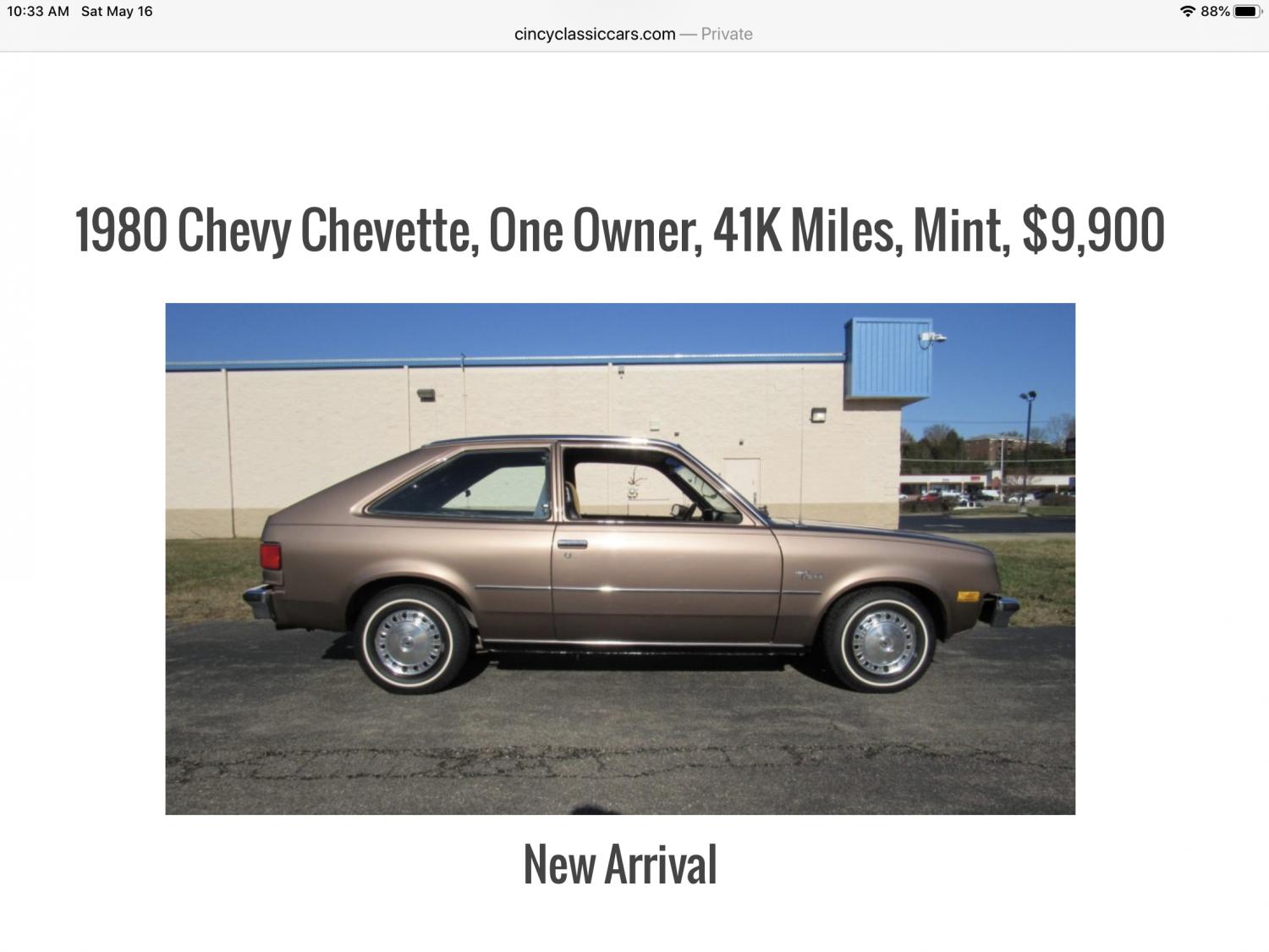 I owned 2 of them. A new 1977 Chevette Scooter ( no back seat - no glove box door - silver painted bumpers ) 4 speed paid $ 2,599 for it new and sold it 2 years later for $ 2,500 loved it !!! Then I ordered a new 1979 Chevette Loaded A/C 4 speed Ho engine F-41 suspension custom interior great cars never had a problem with either of them