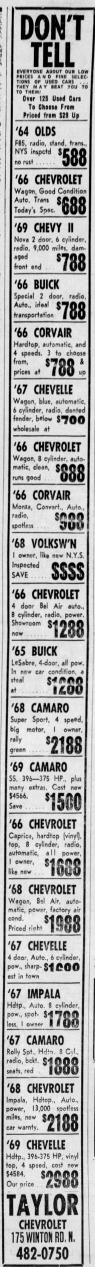 The big 3 Chevy dealers in the Rochester area were Taylor, Heinrich, and Hallman. I owned a 69 Z28 that was sold from Taylor. All would have sold some performance cars; but probably Heinrich was the more performance oriented. They sold a 67 Z28 that was campaigned in SCCA races. A black COPO was sold by one of the suburban dealers. One other notable "car" sold in Rochester was an LS6 El Camino. There was one other 67 Z28 sold in Rochester that I know of. And Heinrich sold a - - 68 Z28 that was pretty loaded.