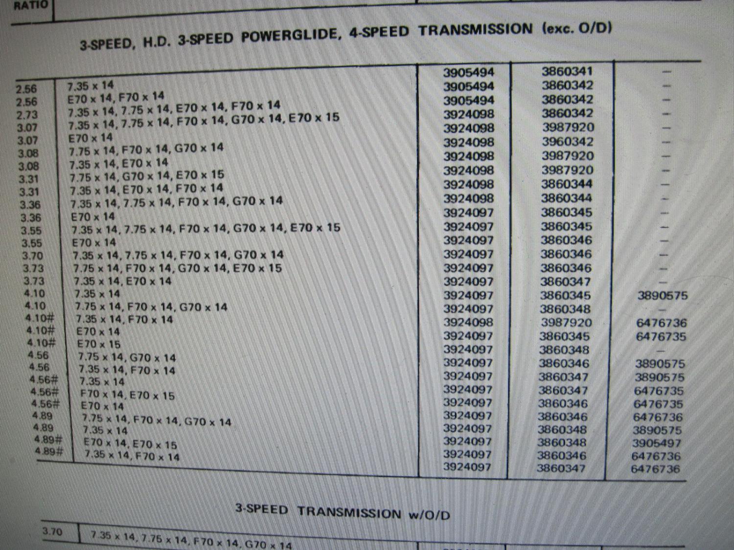 Need info on '69 model year. A COPO Camaro normally came from the factory with 4.10 gears. So what I would like to know E-70/15 tires with a 4.10 rear and Turbo 400. That is the info I cannot find in any GM literature on what adapter to use.