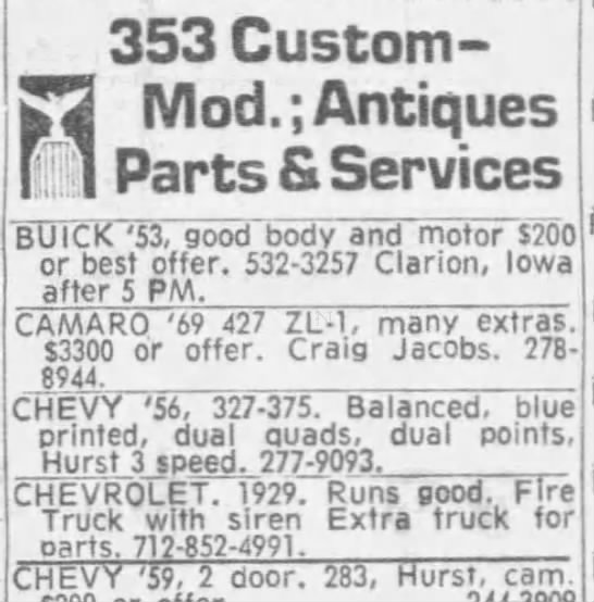 (1st '70 Chevelle SS) The Capital Times Madison, Wisconsin 13 Jul 1973, Fri • Page 30 (2nd Long List) The Los Angeles Times Los Angeles, California 03 Nov 1968, Sun • Page 340 (3rd ZL1) Des Moines Tribune Des Moines, Iowa 27 Sep 1971, Mon • Page 21 (4th ZL1 Hawaii) Honolulu Star-Bulletin Honolulu, Hawaii 03 Nov 1972, Fri • Page 58 (5th Yenko '67 Drafted to war) Star Tribune Minneapolis, Minnesota 28 Mar 1970, Sat • Page 29 |