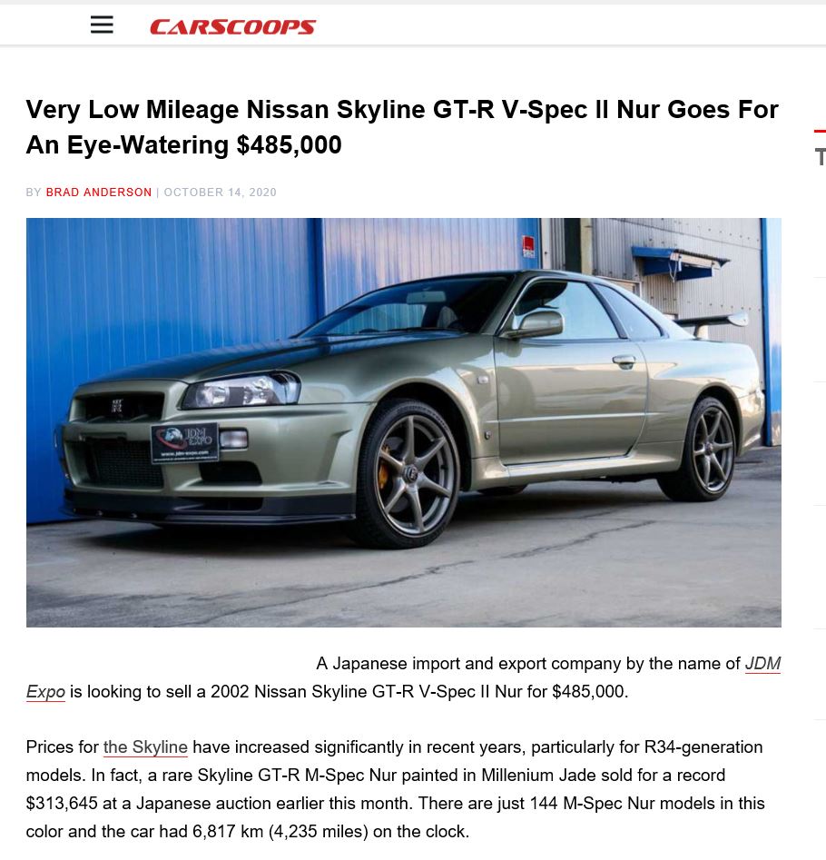 As some of you know, I worked for General Motors for nearly 40 years. I'm now working for Nissan as an Accessory Engineer, so I figure I owe it to them to get up to speed on their performance offerings, including the Z car (and it's history) and the GT-R. As you might guess it's quite an adjustment for me, as an all American "boomer" who grew up with GM muscle cars, to transition to Japanese car culture and collector car mentality. That's why I'm always shocked to see some of these older Japanese cars either going for or asking some big numbers. It seems the era of the million dollar American muscle car has passed. Is the predicted younger generation/Japanese performance car era now on the rise? K https://www.carscoops.com/2020/10/ve...tering-485000/