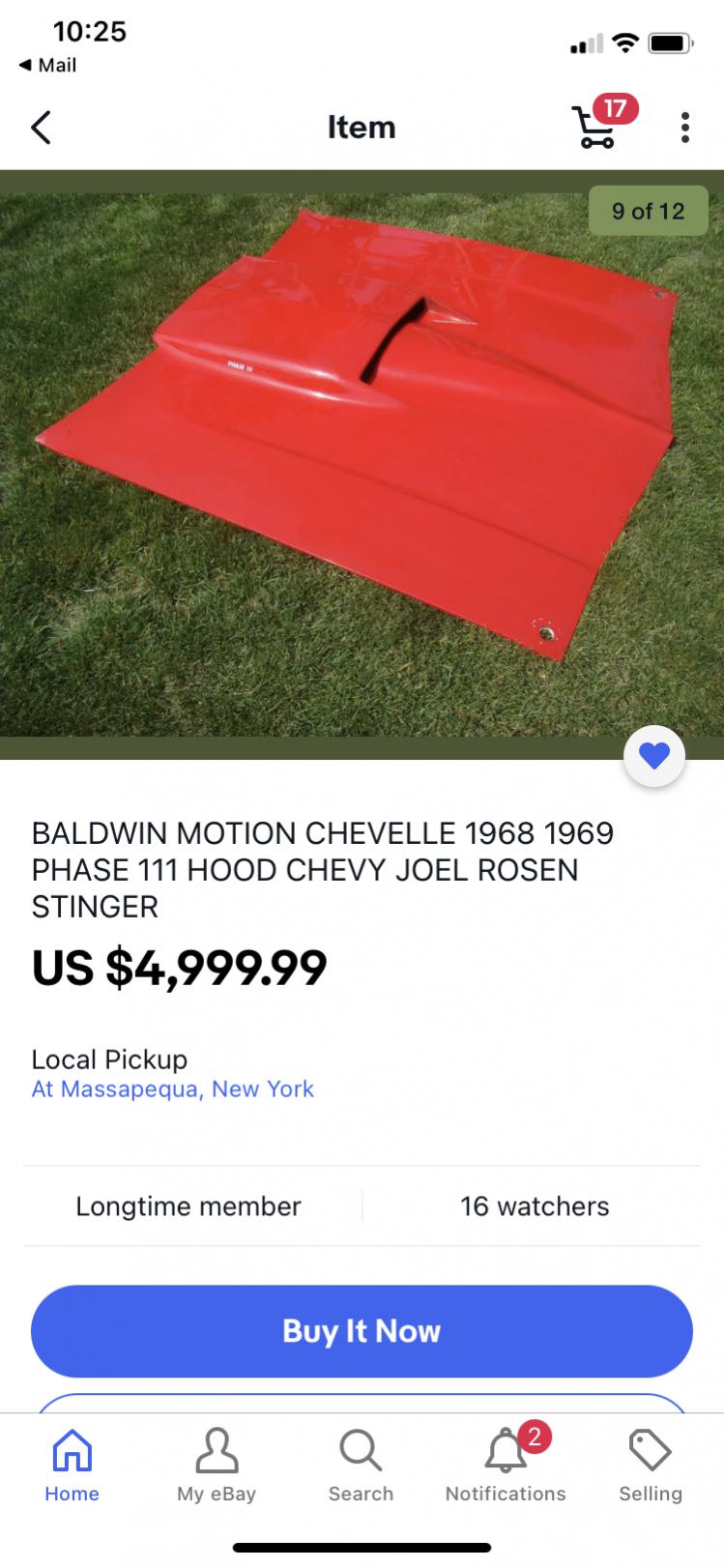 Now on eBay for the second or third time, seller claims this hood was on Joe Gs burnished brown 69 Chevelle while it was painted red and owned by his brother. (FOLKLORE)