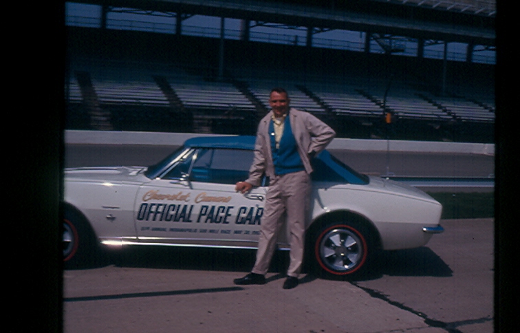 Anton Tony Holman of IMS strictly specified "white cars with white tops" and then after pressure to accept Blue toppers by Chevrolet- Holman got mad and then pushed back and required Chevrolet to pre-deliver two pace car replicas to IMS one full week in advance of the scheduled delivery of the full Zone 25 commitment fleet to IMS - all for simple cosmetic approval by Holman. Norwood Plant Manager Herb Leitz personally represented Chevrolet at the pre-delivery meeting at IMS. Chevrolet then pushed back and produced blue toppers anyway at IMS with Zone managers and Brass arriving in Blue Toppers at IMS for the race. So based upon interviews of Zone personnel, and Management, including the Norwood Plant Manager, - there should be a total of 10 Blue Top Camaro Super Sports used by the 10 Top Indy Metro Area Zone Managers and another batch of 7 or 8 Blue Top Pace Car Replicas that were used for the visiting Brass from Chevrolet Central Office. Below is Zone Manager David Welday at IMS with his "Official Vest" on. |
