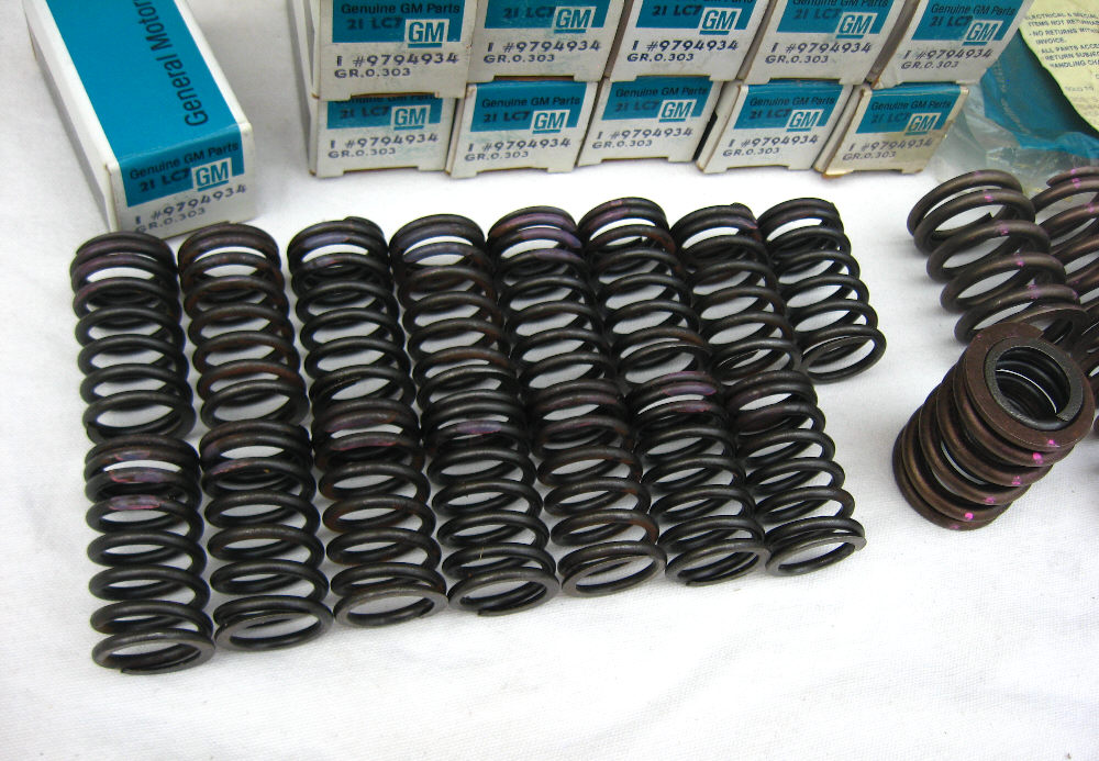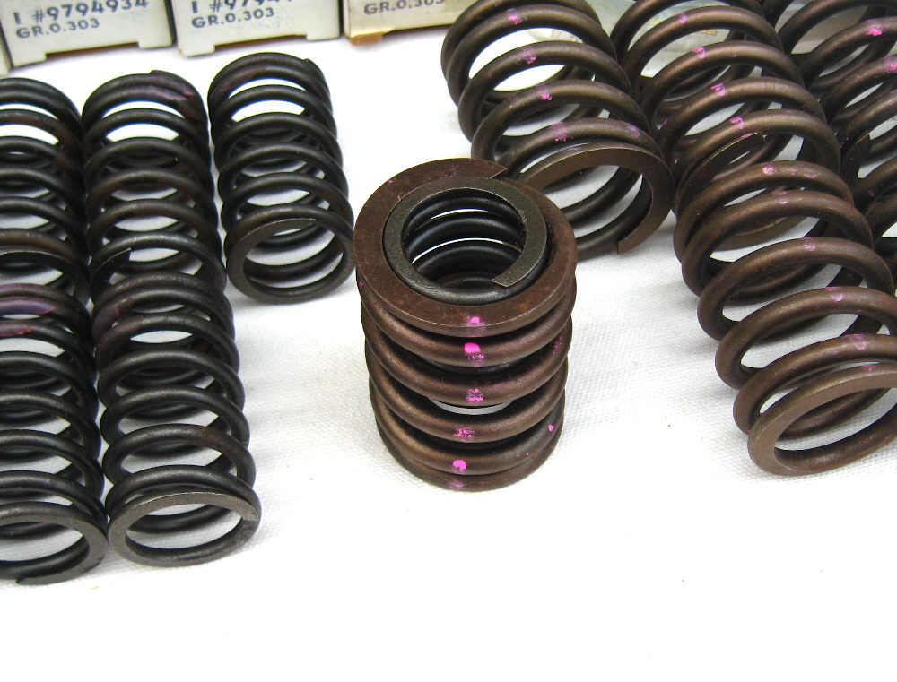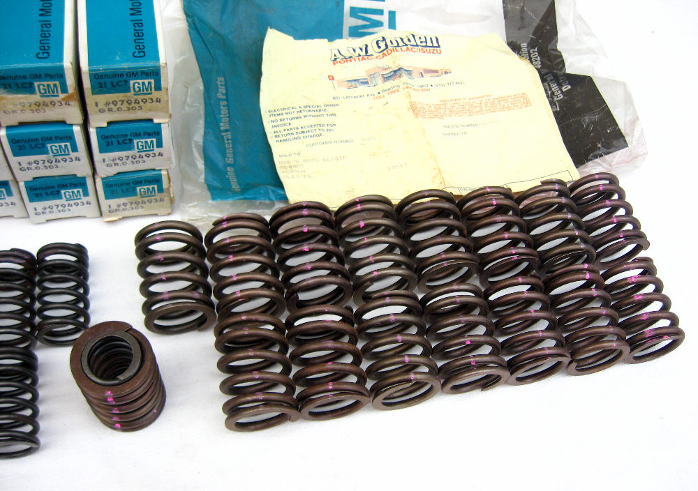 NOS GM engine valve springs. Complete set of (16) inner + outer springs enough for one engine. Marked by GM with purple inspection marks. Correct for both 350 + 400 engines.