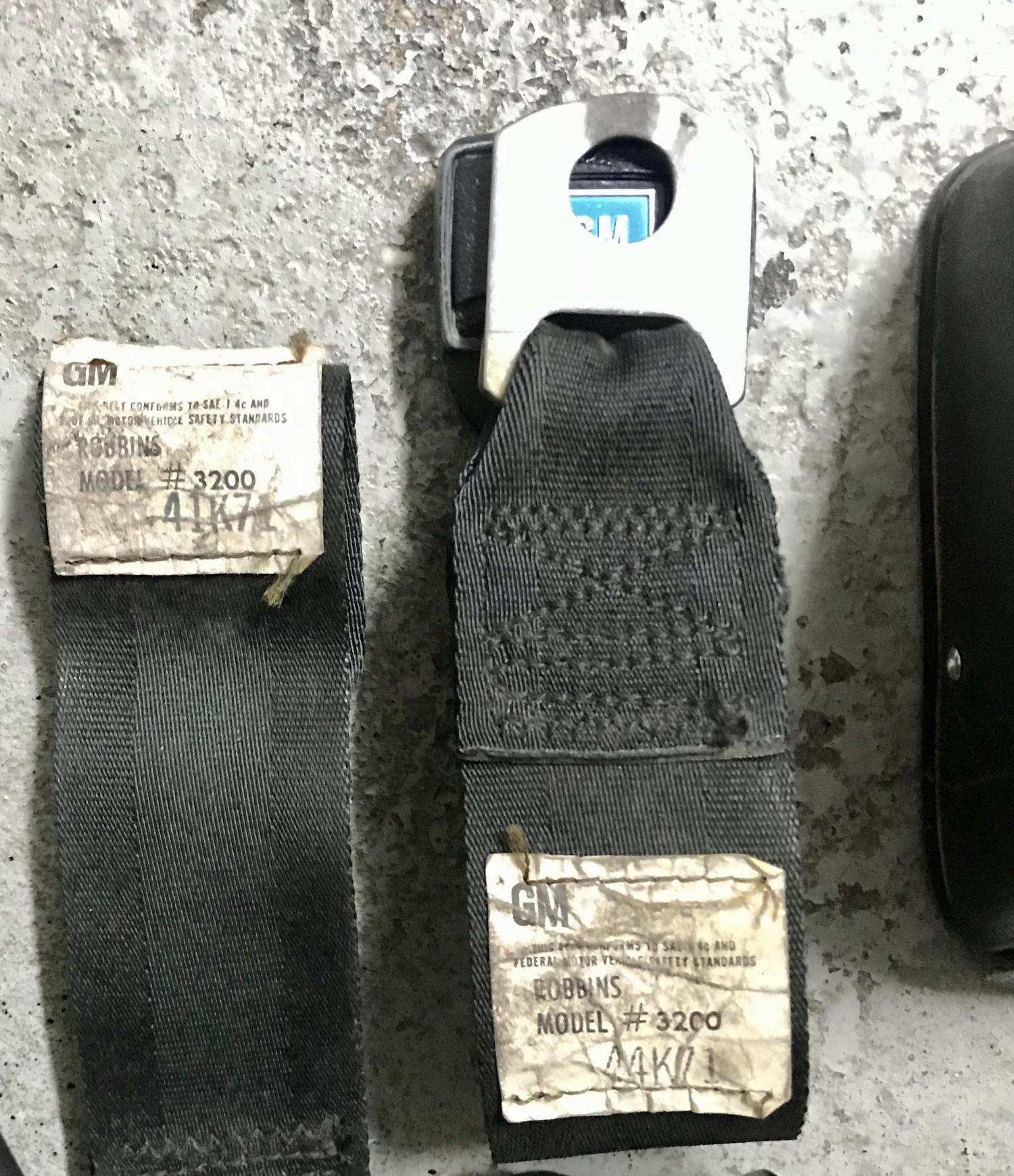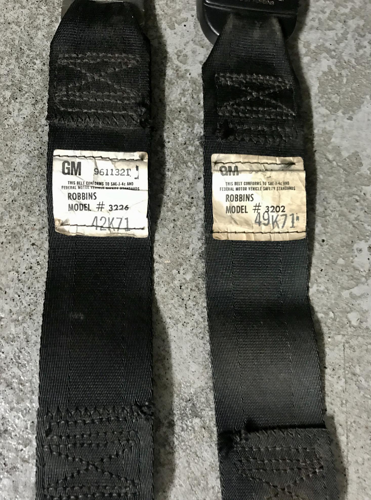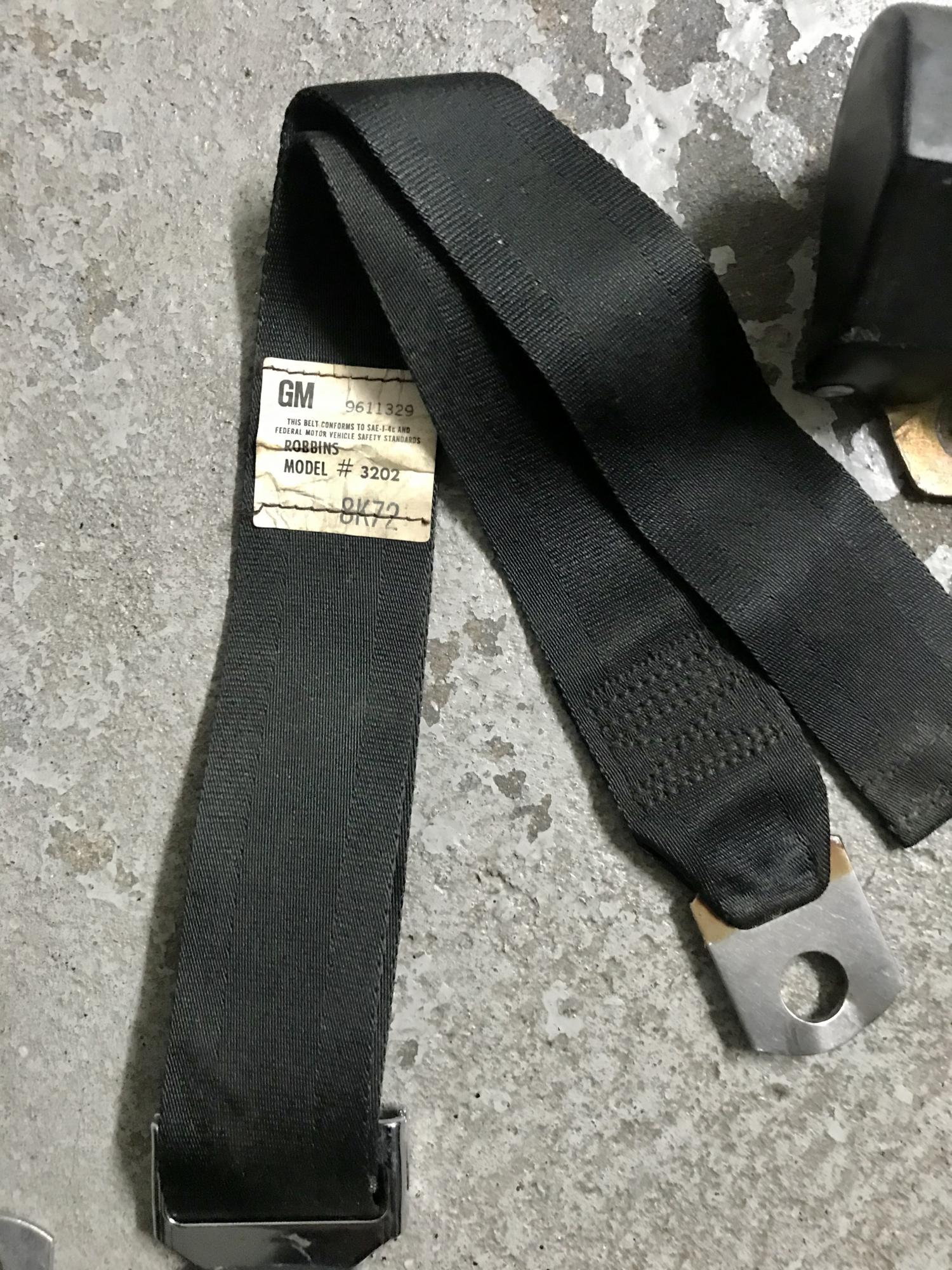 These are black seat belts out of a 1972 Chevelle, RPO AV3 (3 point). They are the small buckle design that was introduced in 1972. They will fit most GM A-body cars of the same year. This is an incomplete set with missing belts so what you see is what you get. These 1972 belts are hard to find due to them being a one year only item. The belts and stitching are in very good condition with all tags present. The chrome on the latches are in great shape. The retractors work as they should. Keep in mind that these came out of a 49 year old car and they do show signs of wear & tear. The plastic button retaining rings need replacing on all the buckles as they are cracked or missing. This is a common issue on this style buckle, especially considering their age. There is a repair kit available (search “the parts place seat belt repair kit”) which replaces the spring, tongue, button, emblem, and plastic ring. (SOLD)