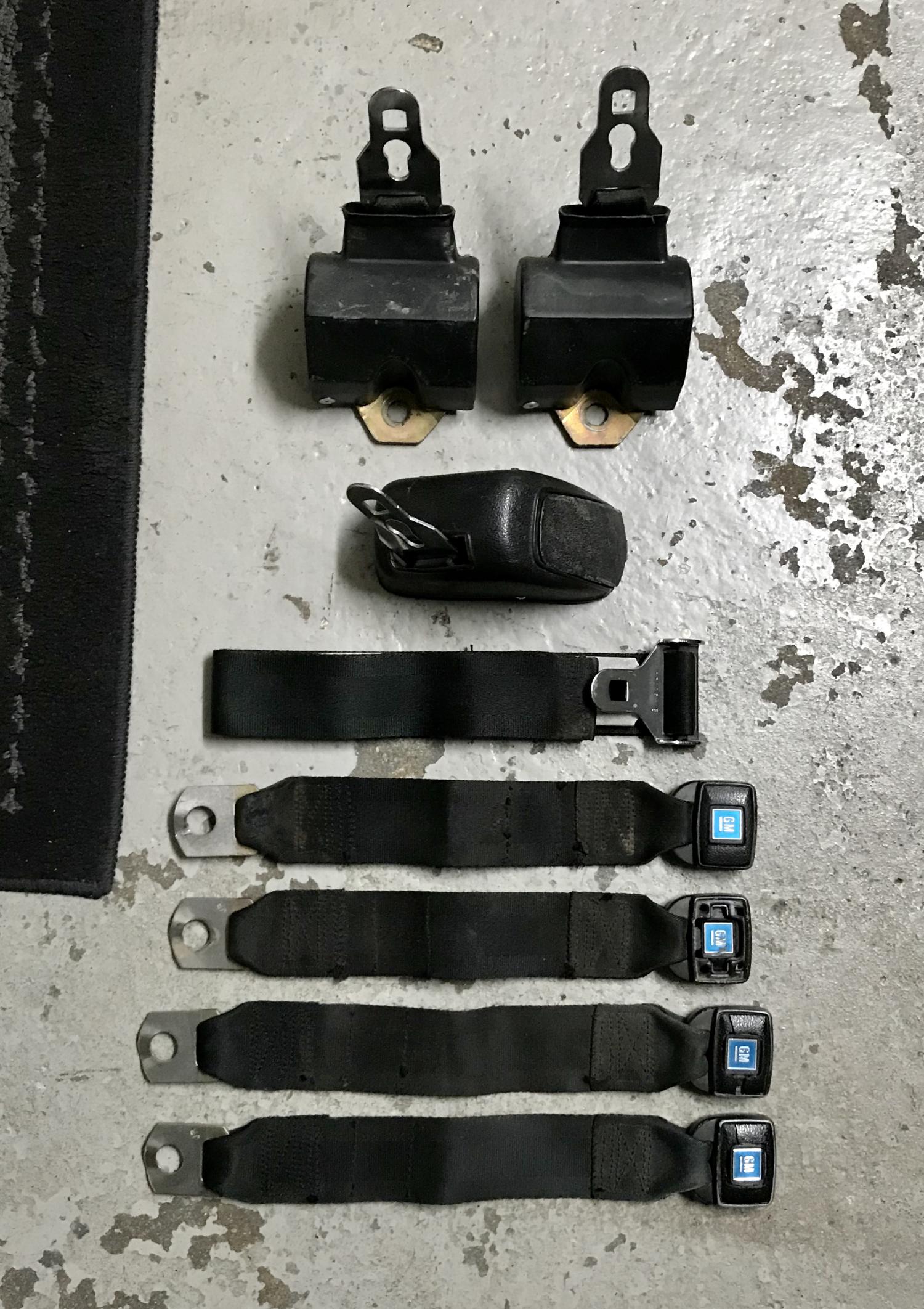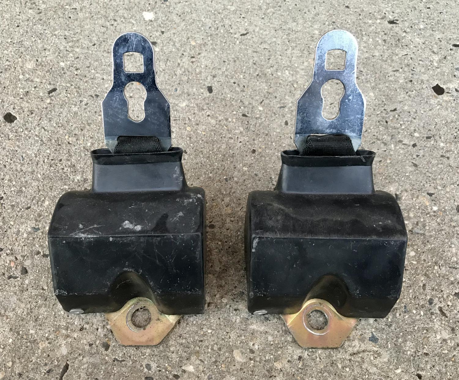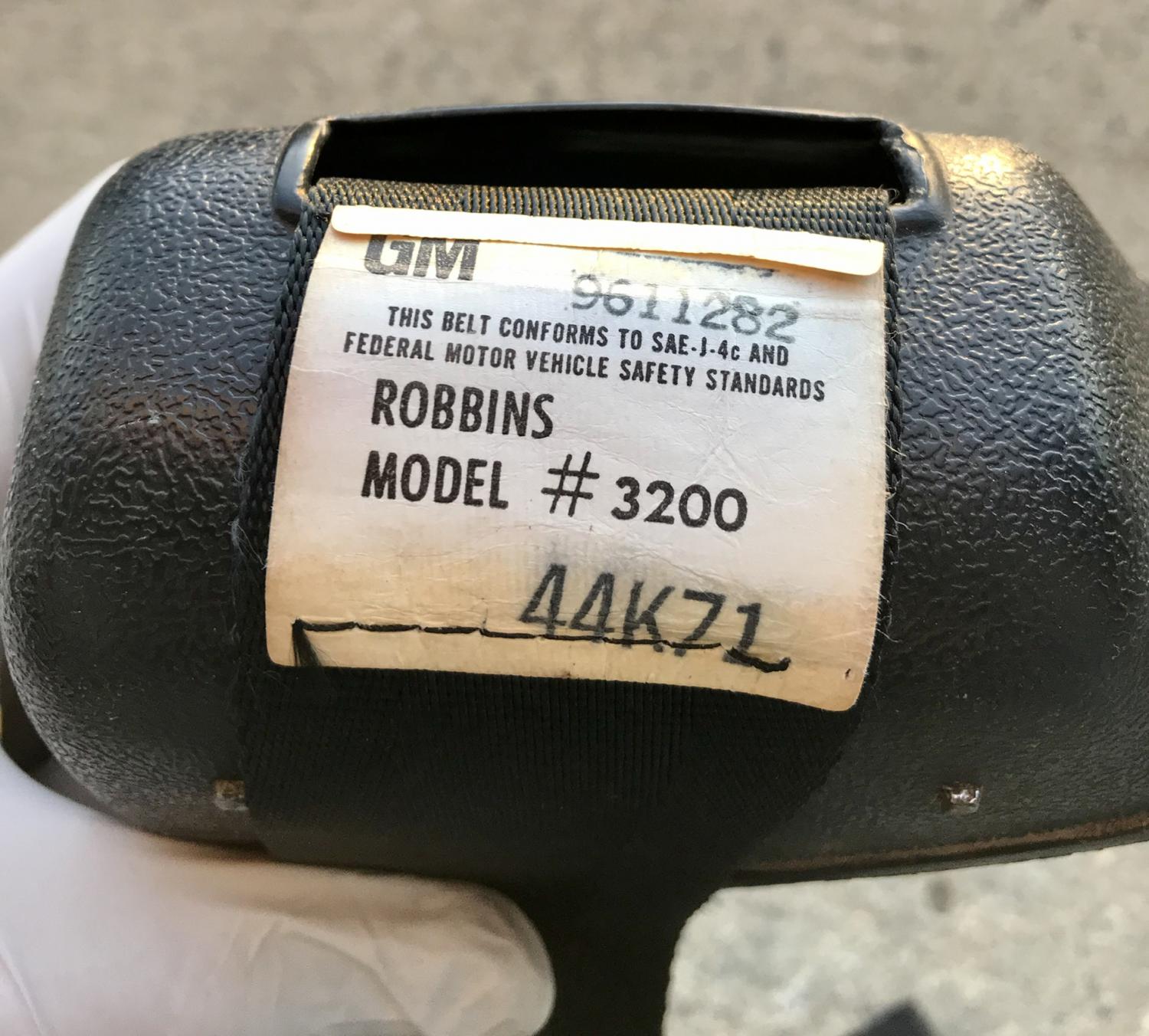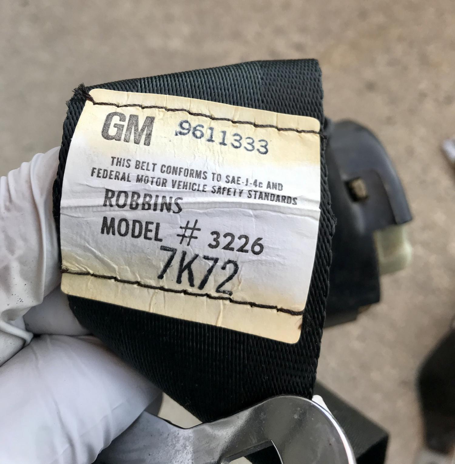 These are black seat belts out of a 1972 Chevelle, RPO AV3 (3 point). They are the small buckle design that was introduced in 1972. They will fit most GM A-body cars of the same year. This is an incomplete set with missing belts so what you see is what you get. These 1972 belts are hard to find due to them being a one year only item. The belts and stitching are in very good condition with all tags present. The chrome on the latches are in great shape. The retractors work as they should. Keep in mind that these came out of a 49 year old car and they do show signs of wear & tear. The plastic button retaining rings need replacing on all the buckles as they are cracked or missing. This is a common issue on this style buckle, especially considering their age. There is a repair kit available (search “the parts place seat belt repair kit”) which replaces the spring, tongue, button, emblem, and plastic ring. (SOLD)