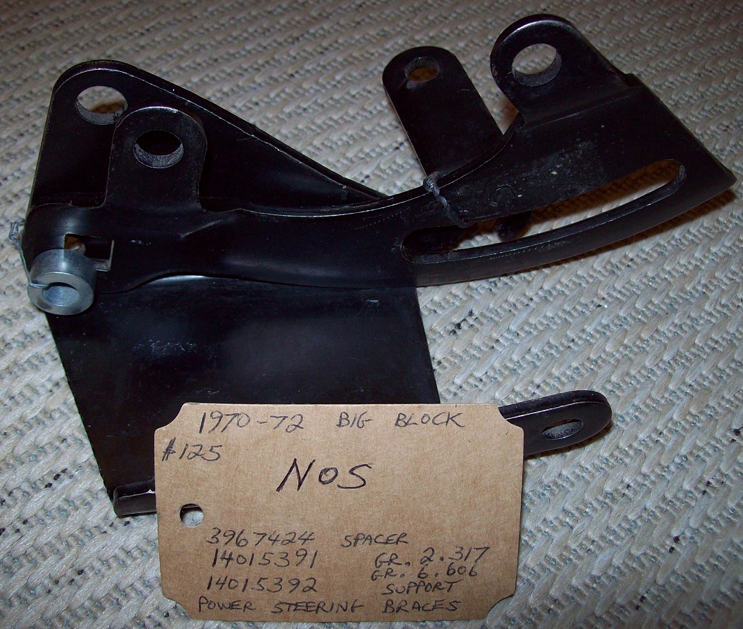 -14015391 Lower bracket 14015392 Upper bracket and 3967424 Spacer, three piece Power Steering Pump hold down set 2nd design $100 -3880140 12 bolt open rear axle pinion gear $35 each -3954480 Axle Crush Sleeve spacer $15 each -7806748 Manual Steering Cover Cap kit $75 -3973060 Tilt or Turn Signal Knob $60 each -3865886 Distributor to pump shaft for big blocks $60 each -337559 Thick washer $10 each -1362249 Bumper Bracket washers with serated teeth $10 each -1497525 EB Brake Cable Equalizer $30 -15553615 Muncie rod retainers $10 each -3961580 Passenger side front stereo speaker bracket $70 -8796920 Convertible RR Weatherstrip $100 -7313151 Passenger side front stereo speaker with 3961580 bracket $150