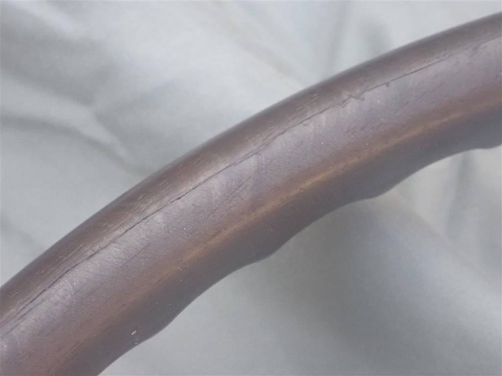 This wheel is certainly no virgin but neither are you. It is a nice survivor overall with obvious cracks at the 6 and 9 o clock positions as show. The rim is not bent or bowed. The wood color and grain is quite nice. This wheel would be right at home on a original car that has light wear throughout or I'm sure it could be taken to the next level in the right hands. $550 Jason |