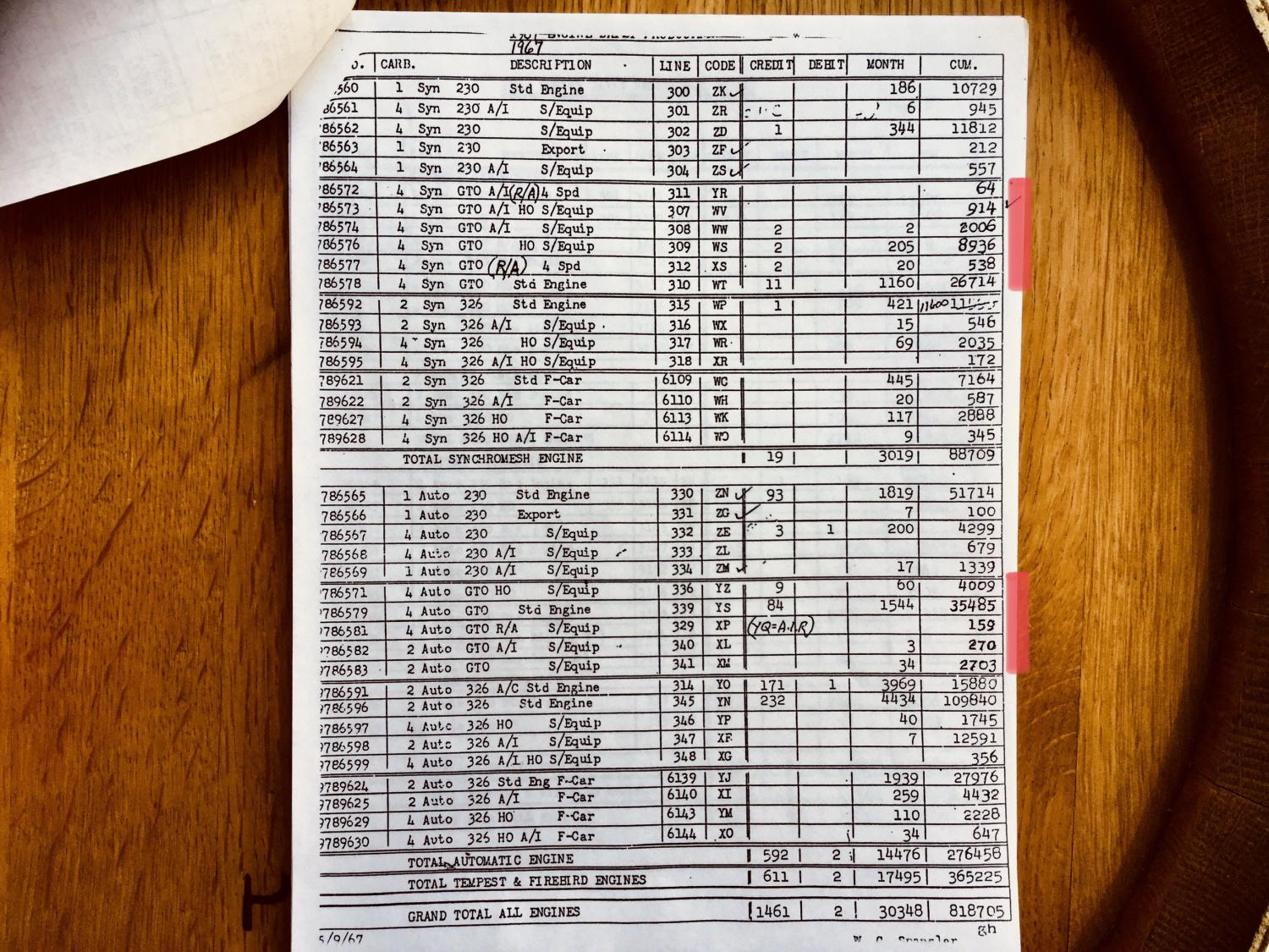 If a ‘66 GTO was sold “New” in the state of California it would now have the A.I.R (Smog with air pump) on all models EXCEPT “Automatic with Tri-Power”. 1966 Engine codes with A.I.R. code #616 shown below. WV - 4 Spd. / Tri-Power. WW - 4 Spd. / 4BBL. XE - Automatic / 4BBL. The YR code Automatic / Tri-Power did Not require A.I.R. but instead was the last model to only have the #614 if sold New in California. The ‘66 YR #614 utilized a molded rubber hose from the center carburetor over to a nipple on the chrome twist “sealed” oil fill cap. The opposite RH valve cover was now solid (no holes or plugs). The 1966 GTO with engine code YR had a build of 1759 total. There is no record showing the total of the California YR with the #614 option, but it should be substantially less. The ‘66 Car Billing History Card, as well as the Window Sticker shows #614 for this sold New in California YR GTO. Chart showing Engine/Transmission with codes and total builds for 1966. Last edited by 60sStuff; 05-28-2021 at 09:41 PM. |