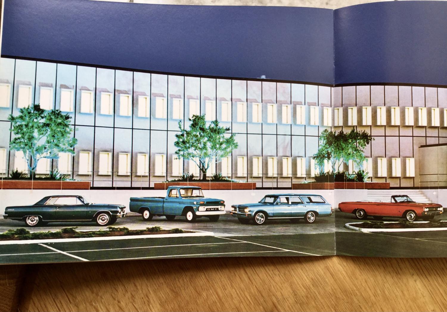 I was given these mint commemorative folders in 1990 from the chief of security at this GM Plant, Mr. Robert Gonsalves. I worked for the local water district (ACWD) with Mr. Gonsalves son, Steve, Steve told his dad that I was a GTO enthusiast. Several weeks later Steve comes to work and hands me this large packet of from his dad. It was souvenirs from the Grand Opening in March 1964. I was speechless. Here is the information and color photos in order from within this dedication packet. The first two photos of the plant. Summer time. Winter time. This photo shows the UAW office with red roof across the street. |