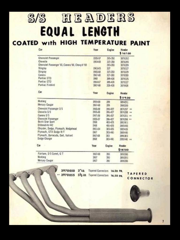 64-71 GTO is noted as #202-13 + 202-33 w/ 1-5/8 Tubes and 3" Collectors on this '71 M/T Scavenger List below. ![]() ~ Pete .