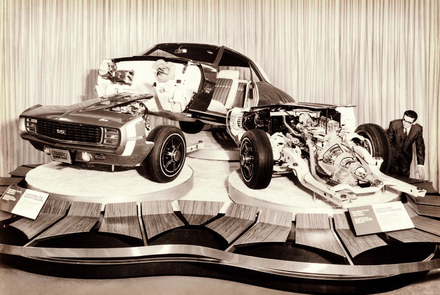 This Camaro is referred to as the "Double Header Car" as it has both a 6-cylinder base model front end as well as an RS/SS 350 front end which sat on a series of three turn tables and could be interchanged to display either version of the car with just the push of a button.