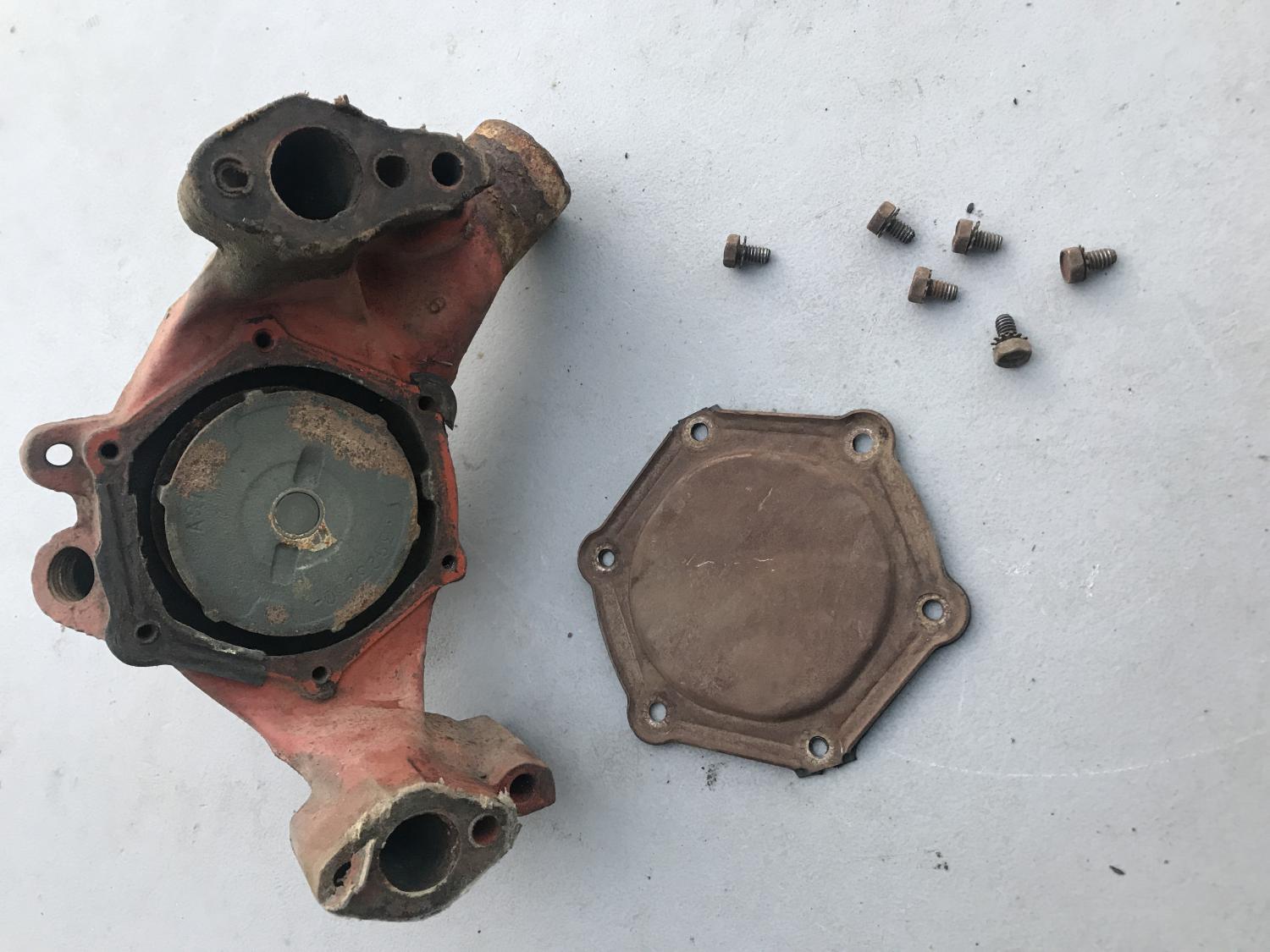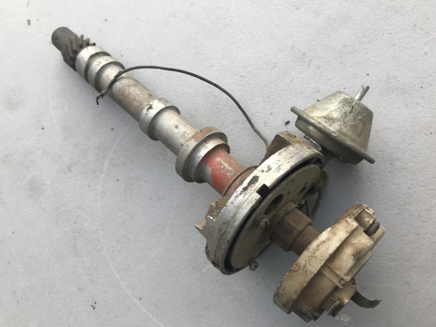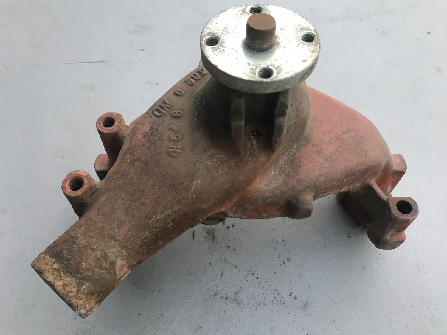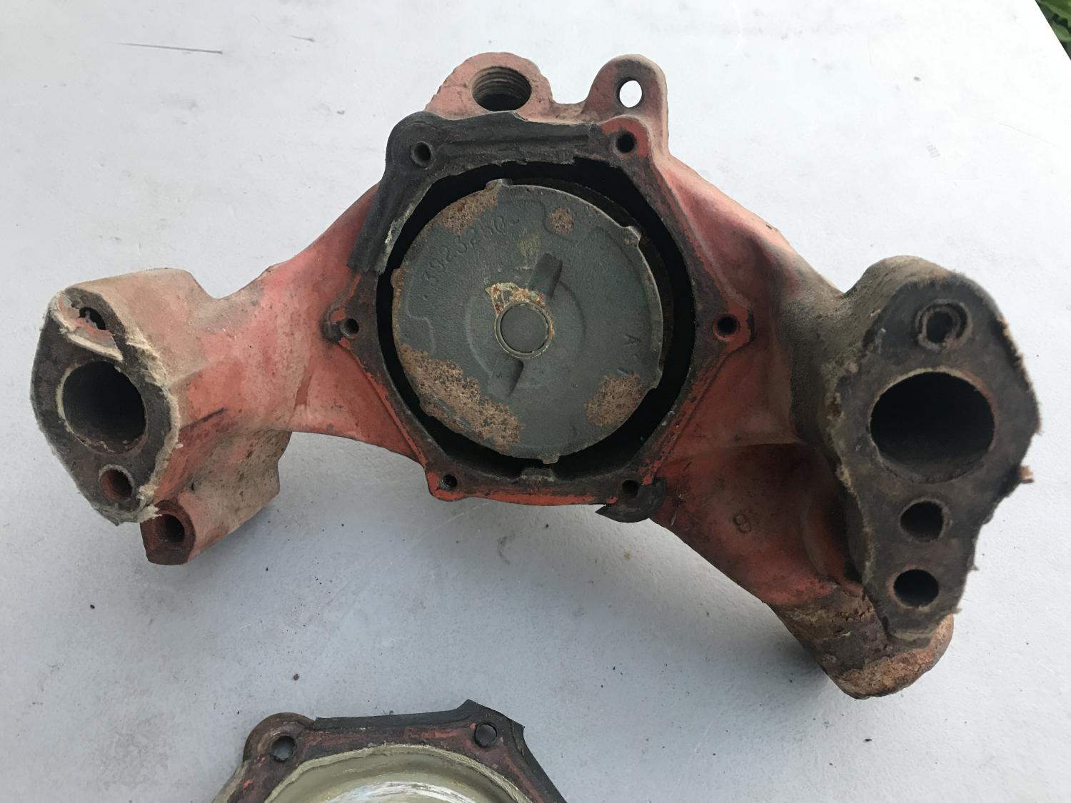 1111489 350 / 300 AUTO distributor with the 526 CCW cam but otherwise bare - replacement vacuum advance, spins tightly. Date 8H21 - Sept 21 68 Next is the early 3927170 / 170 long water pump - definitely a core - front bearing is out and the shaft is loose and wobbles - not sure if repairable - I removed the back cover but can't remove the shaft / internals. original 3923250 cast impeller is there. either piece $50 plus $16 to ship USPS with tracking, $66 PPFF total for each. Email with questions, thanks as always. Anthony |