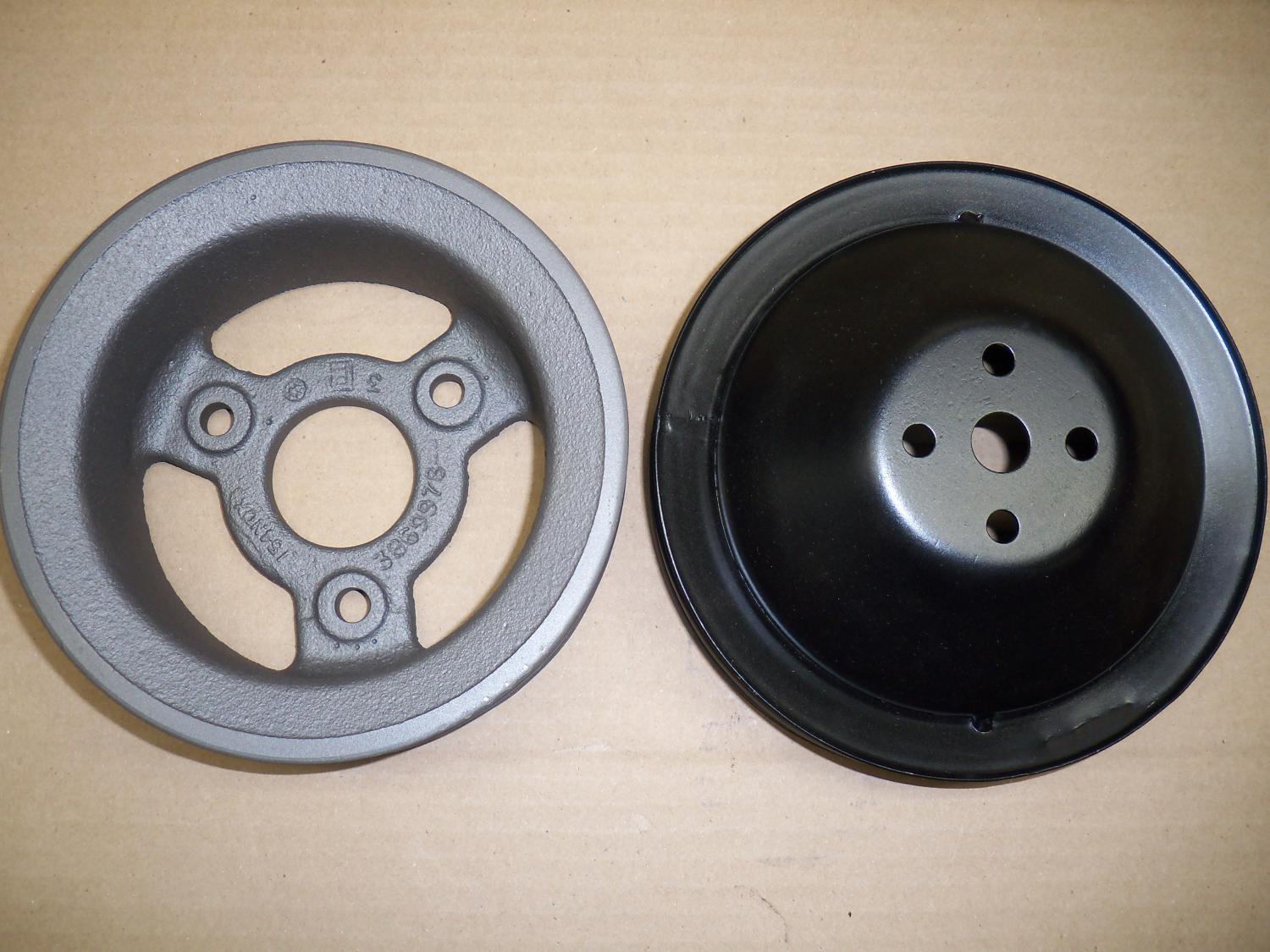 Up for sale is a pair of original 1966 396 high horse deep groove pulleys, water pump pulley 3864480 and cast iron crank pulley 3869978. The water pump pulley part number is not stamped, has the 2 spot welds that ID this as a 4480.