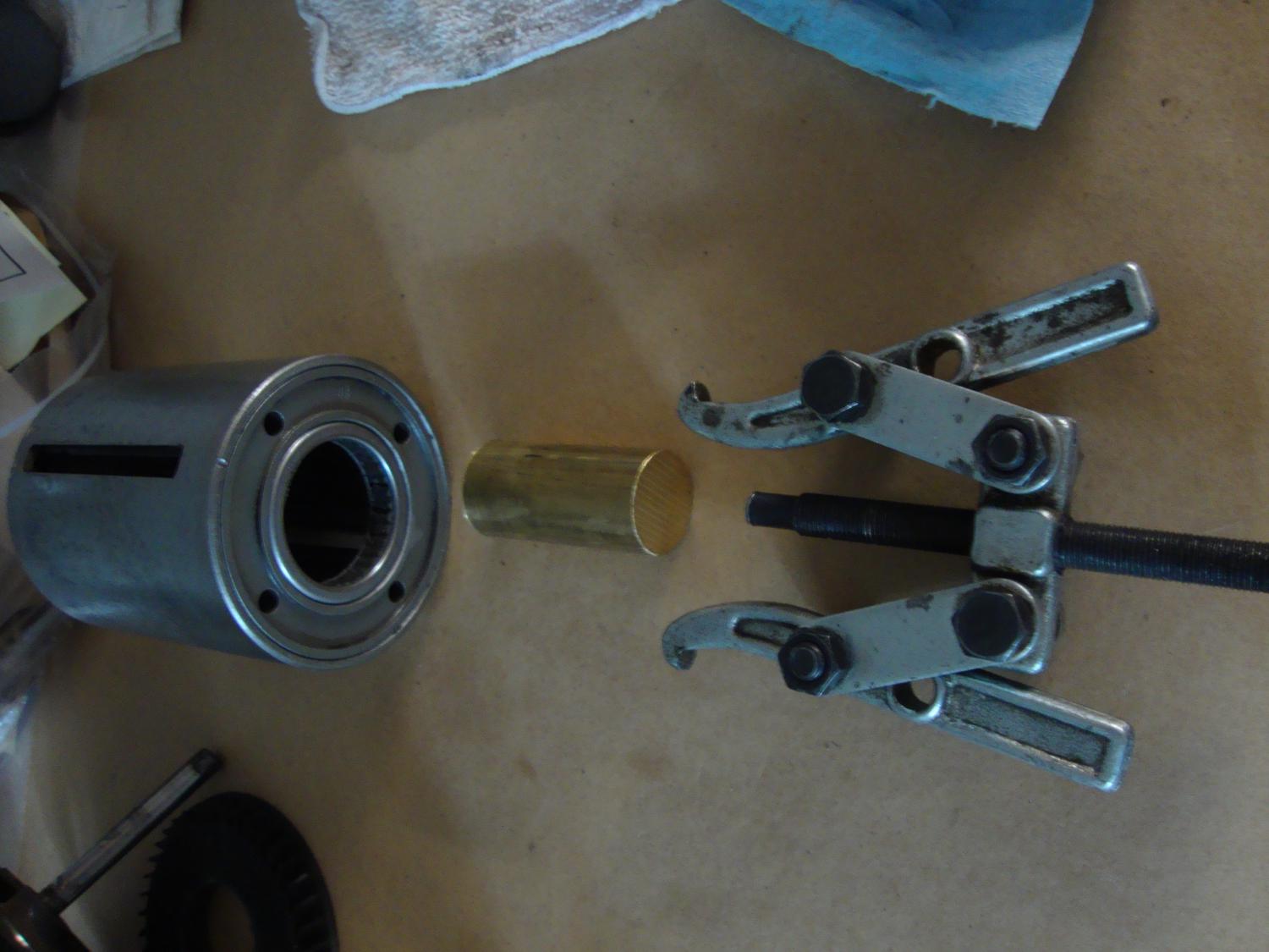 The Large Torrington Bearing is mounted in an ENDPALTE that is then pressed into the open end of the rotor barrel. I used a three-jaw puller with the legs rotated and pressed against a solid piece of round stock placed inside the rotor cavity, to Pull the endplate with Bearing. Another option is to press the bearing down inside the rotor barrel and pull it out, but often the rotor blades and internal bearings are a source of interference. I ONLY work on De Vaneing them, Not interested in a working pump. Llyods instructions over at Camaros.net were very very helpful